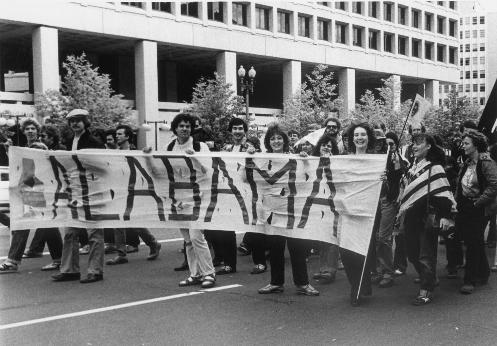 Photograph shows a contingent from Alabama as they march in the National March on Washington for Lesbian and Gay Rights. They hold a banner that reads, "Alabama".