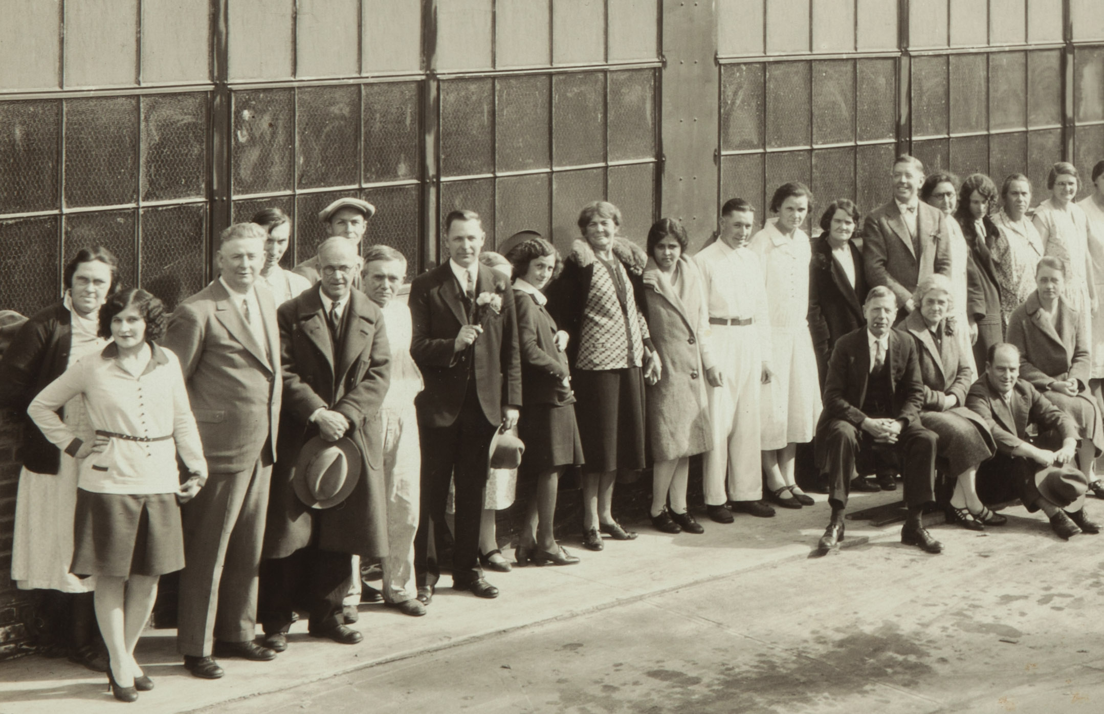 Liberty Laundry staff, parking lot and west building, 1928. The second image is a closeup detail. William O. Pickford, third from left. Rollin A. Pickford Sr. (the artist's father) is the tallest man just left of center.