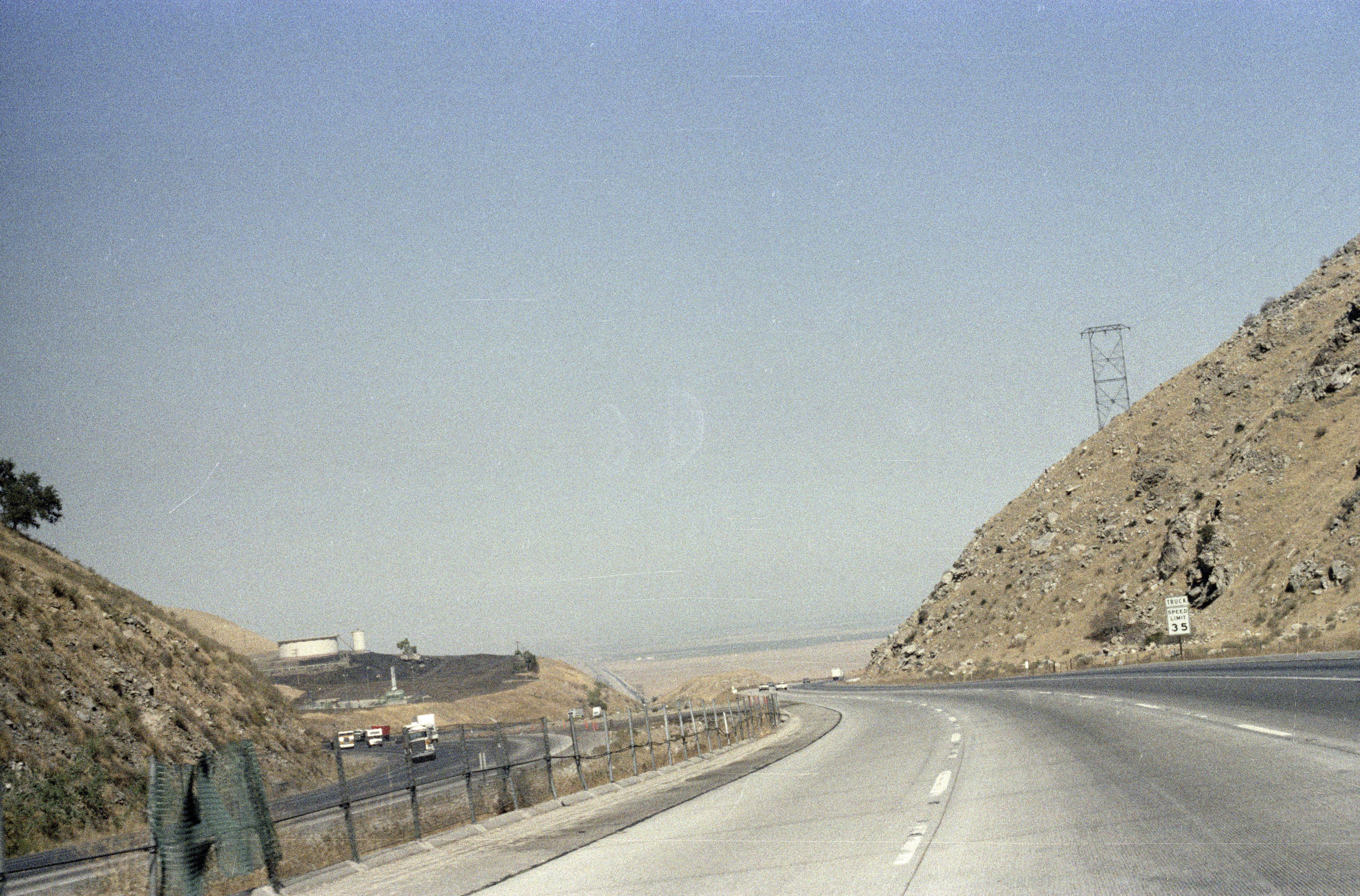 Chain link fence center divider; large storage tank on left; power lines on right 35 MPH truck speed limit sign