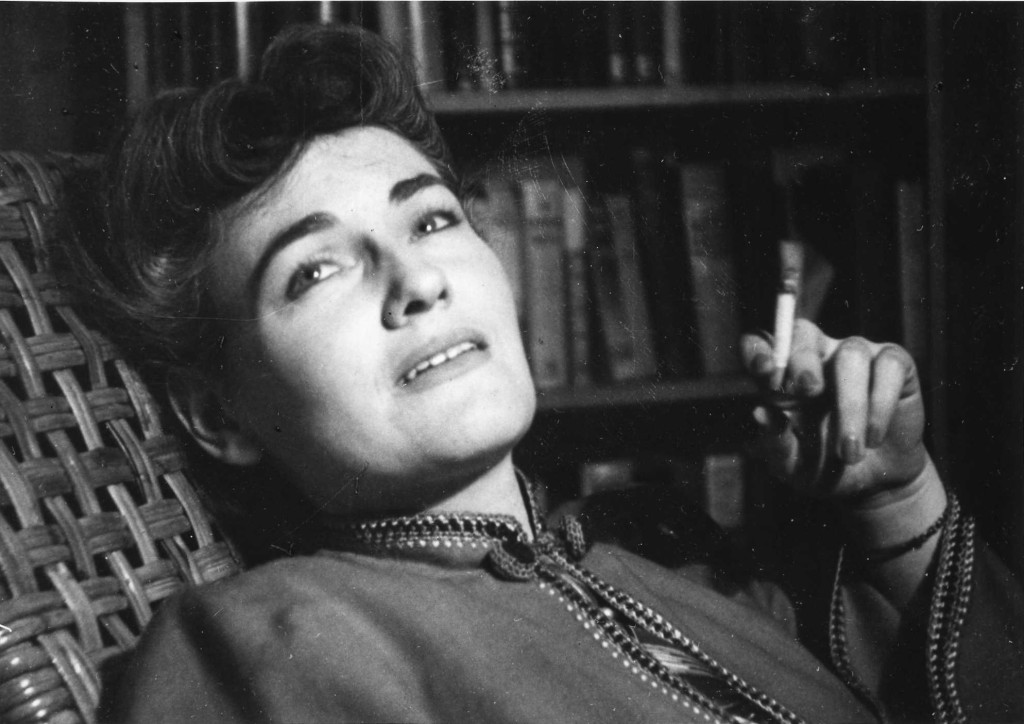Toni Jackson lounging with a burning cigarette in her hand. Jackson, also known as Toni Ricketts, lived with Ed Ricketts for seven years.