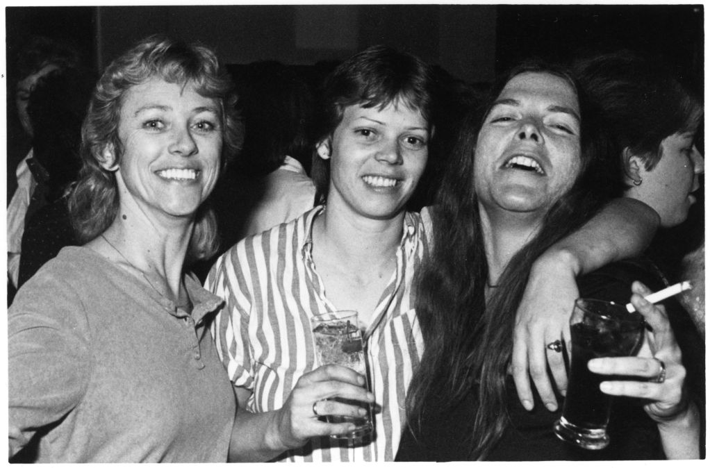 Three women pose for a photograph. The woman on the right is smiling. The woman in the center is holding a drink and has her arm around the woman on the left, who is also holding a drink, a cigerette and is laughing with her eyes closed. Several people appear in the background.