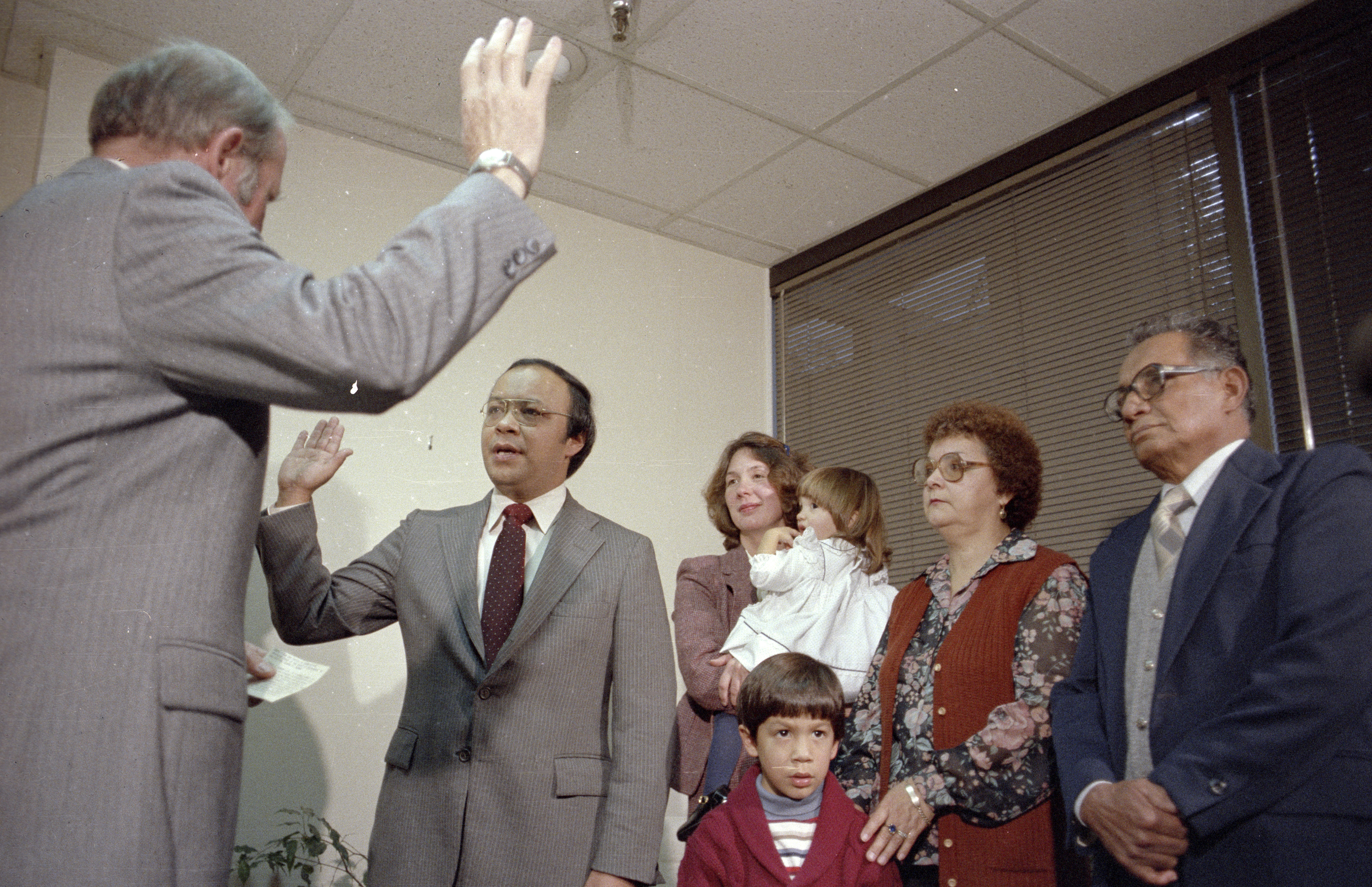 Judge Frank Creede, Jr., Mario Olmos, Mary Louise Frampton holding Margaret Olmos, Daniel Olmos, Mario's mother Delores Olmos and father Fidel Olmos Law Offices of Olmos and Frampton at 925 N St. #150, Fresno