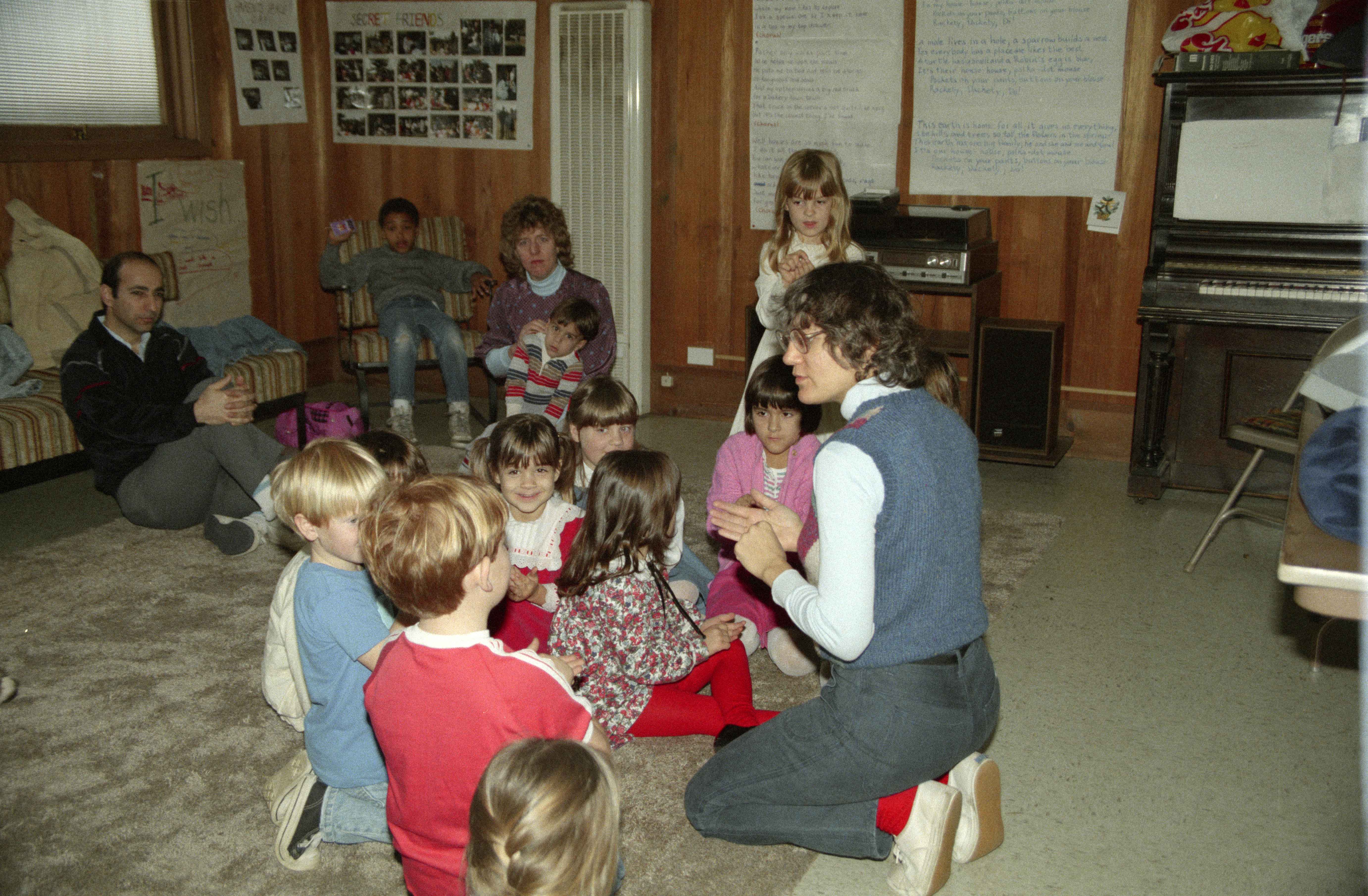 Teacher is Paula Siegel, Patrick Hatcher in blue tee shirt, Sean Hatcher in red tee shirt, Robin Watkins in paisley dress, Leah Hanzlicek in blue dress, and Margaret Olmos in green outfit