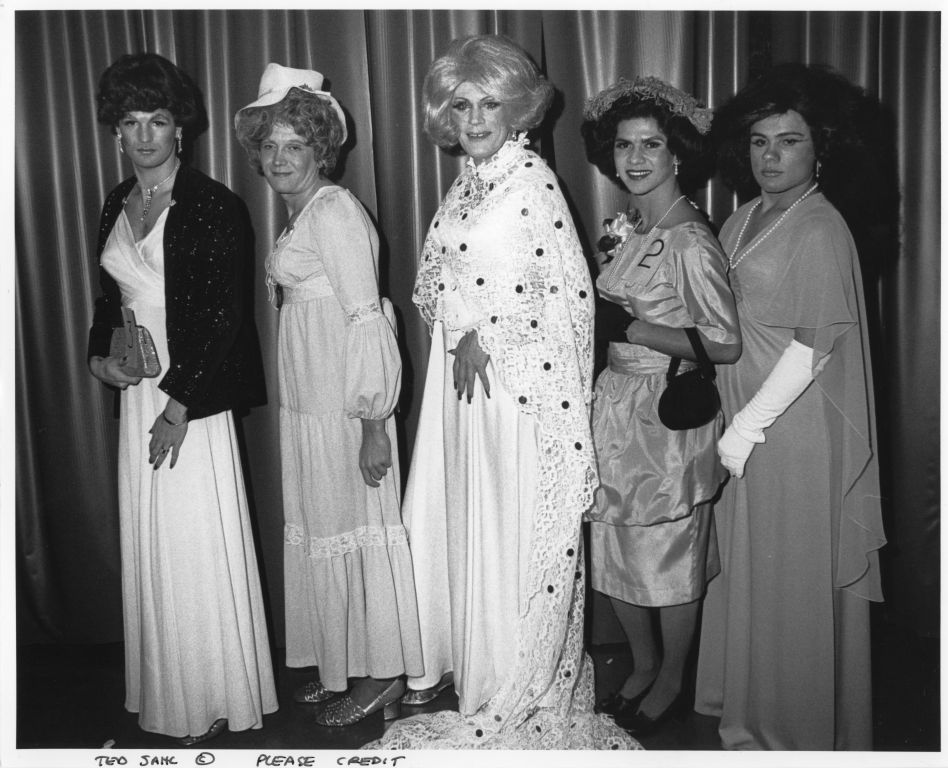 Five female impersonators wearing evening gowns pose for a photograph during the "Closet Ball Queen" competition. Gerry Okeefe the winner of contest is flanked on both sides by the other four contestents. She is wearing a long white gown and lace robe.