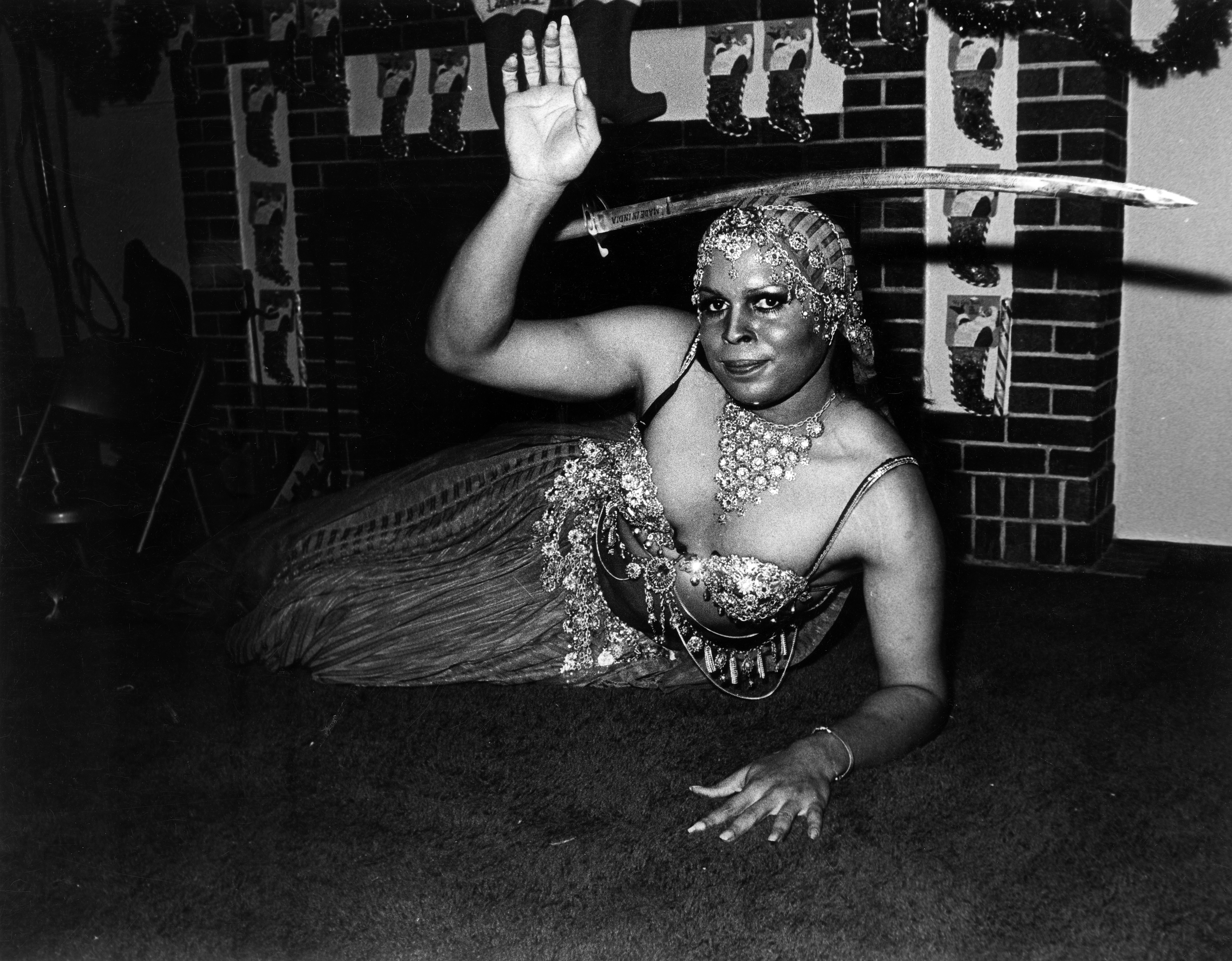 Photograph shows female impersonator dressed as a belly dancer lying on the floor on her side. Her right arm is held up into the air, her left arm props up her upper body and a sword balances on her head. Behind her is a fireplace decorated with Christmas stockings.