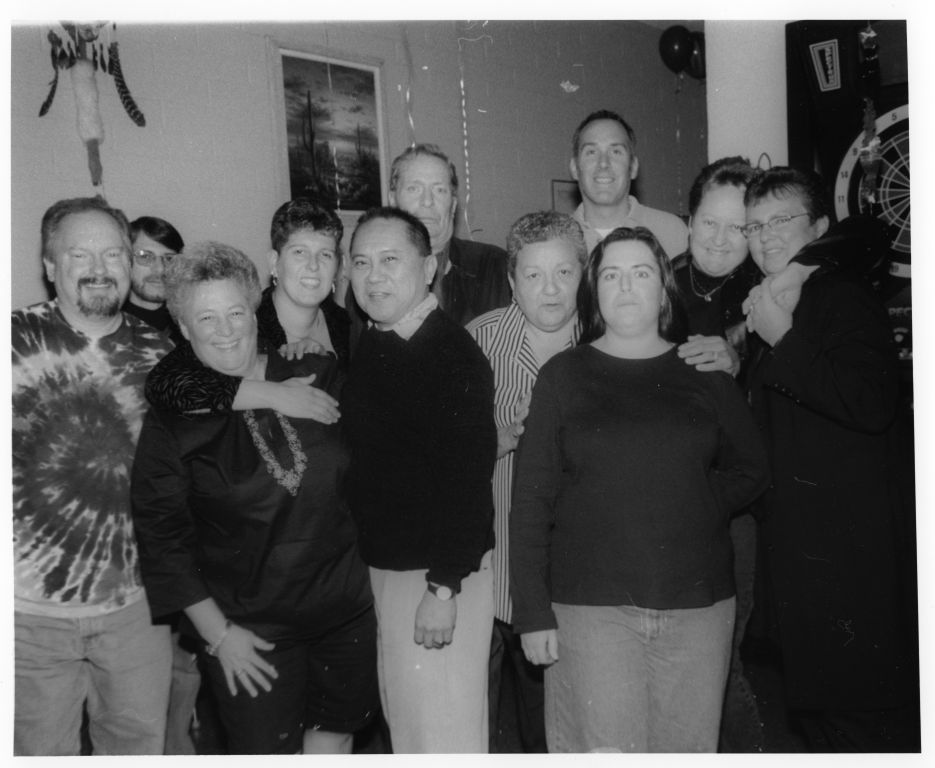 Group portrait of men and women at an unidentified gathering associated with the gay and lesbian community. Balloons, streamers, and a dart board can be seen in the background.