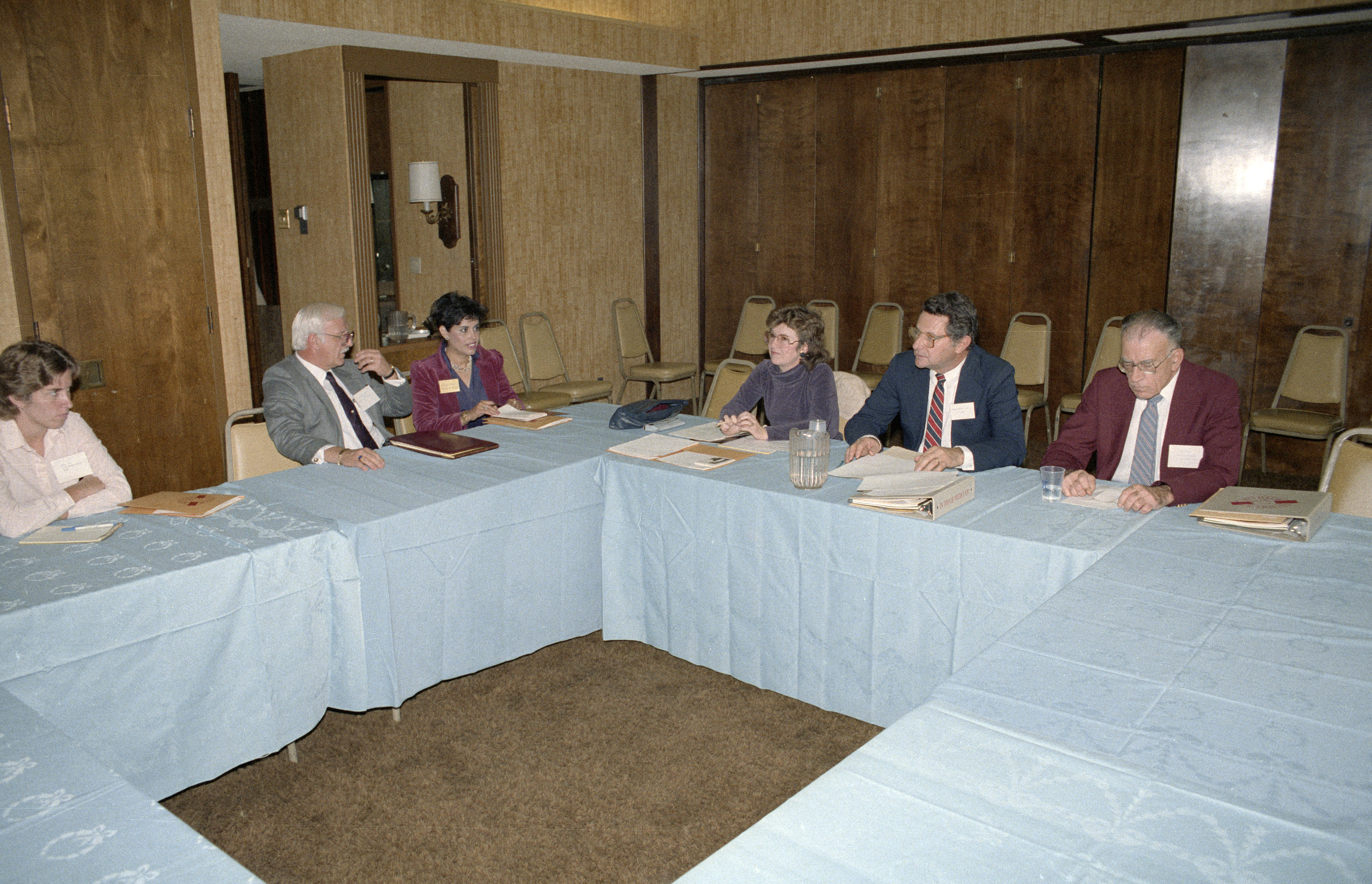 Media workshop: on left middle: State Bar President Burke Critchfield; on right, reporter Carol Corey, Judge Robert Coyle and ? Carol Corey became an attorney in 1987