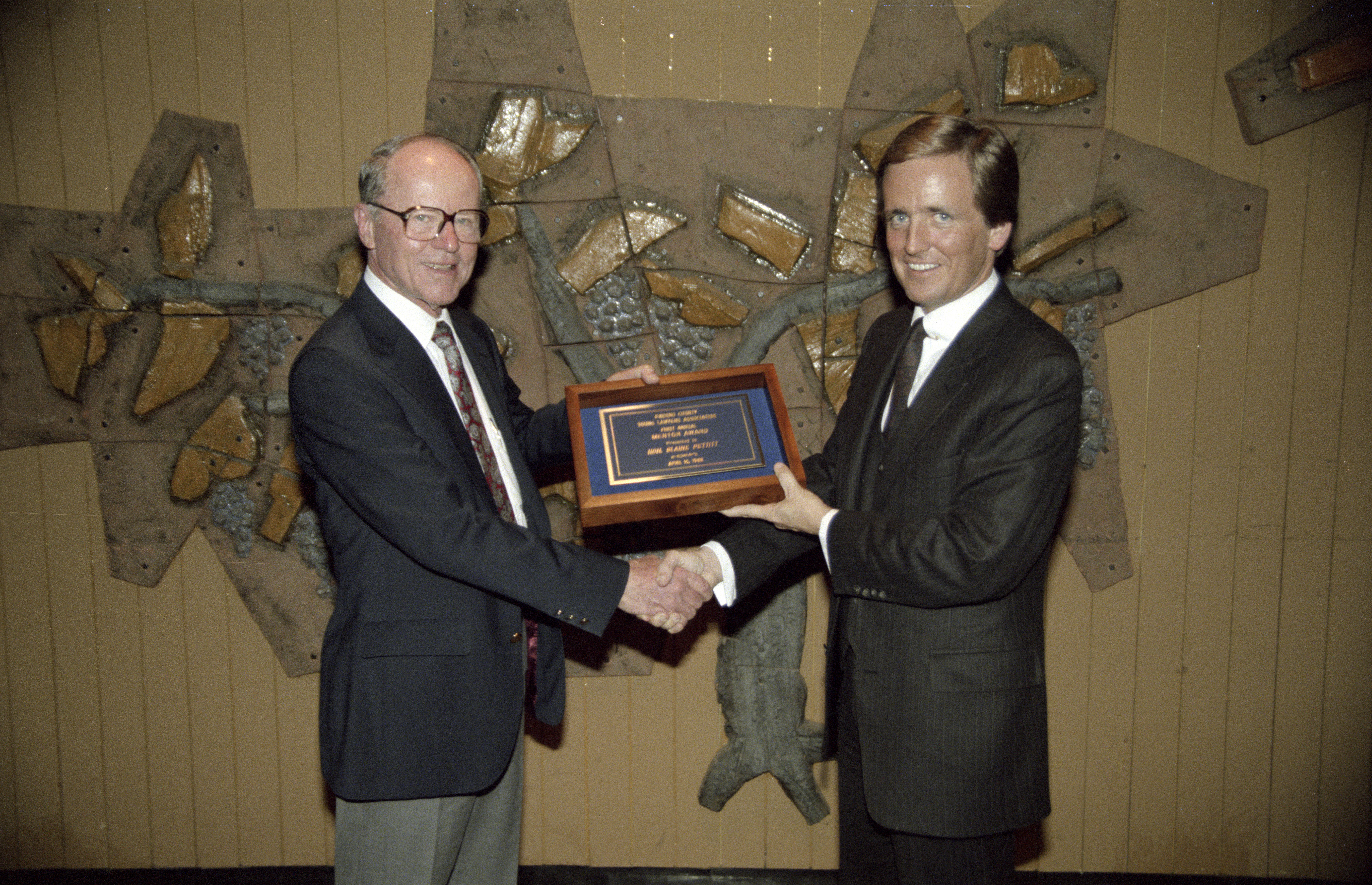 Judge Blaine Pettitt and Fresno County Young Lawyers Association President Brad Hill shaking hands and holding Fresno County Young Lawyers Association Hon. Blaine Pettitt Mentor Award