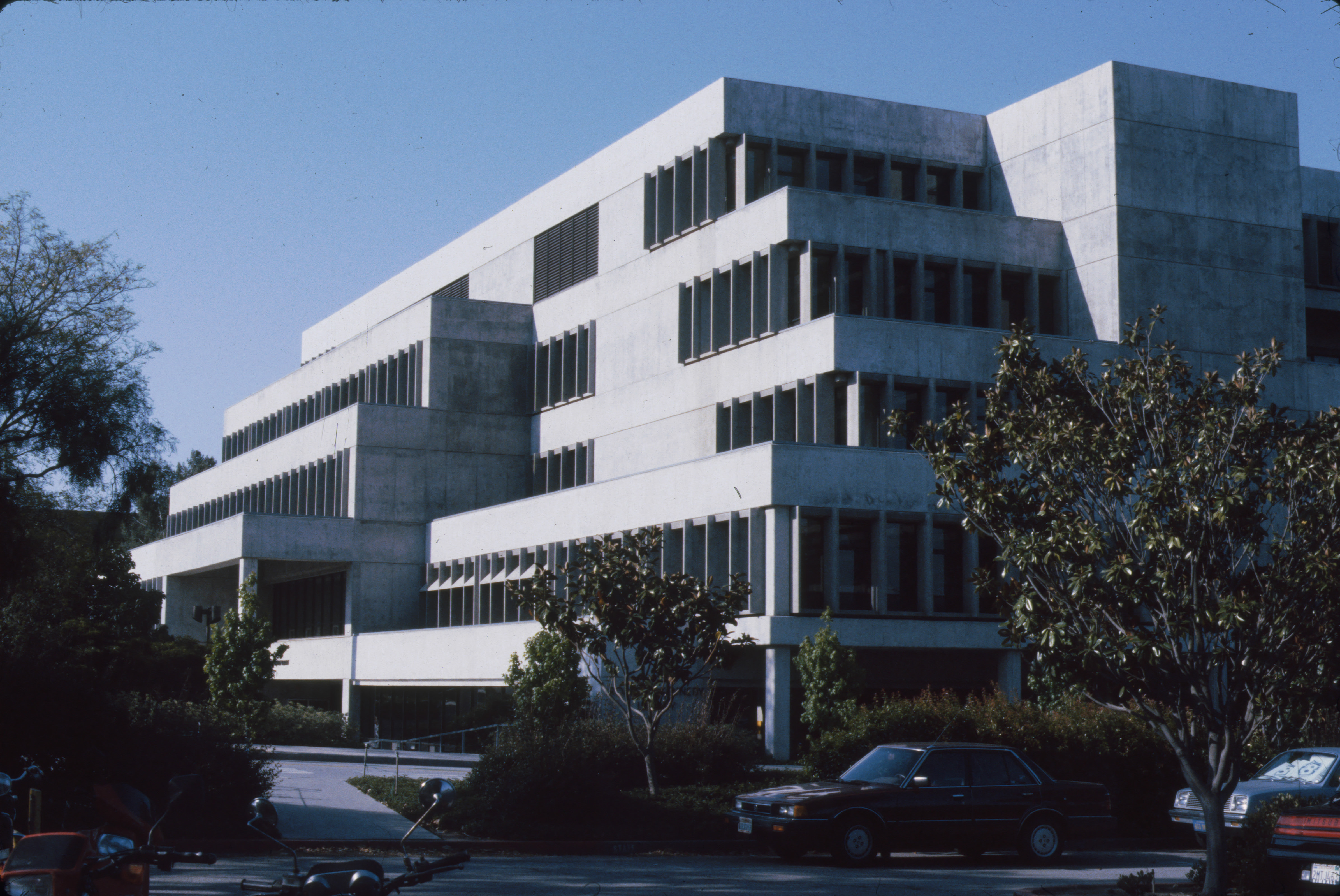 A view of the west facing side of Kennedy Library, from the adjacent parking lot to the building. This image was taken almost two decades after the completed construction of the library.