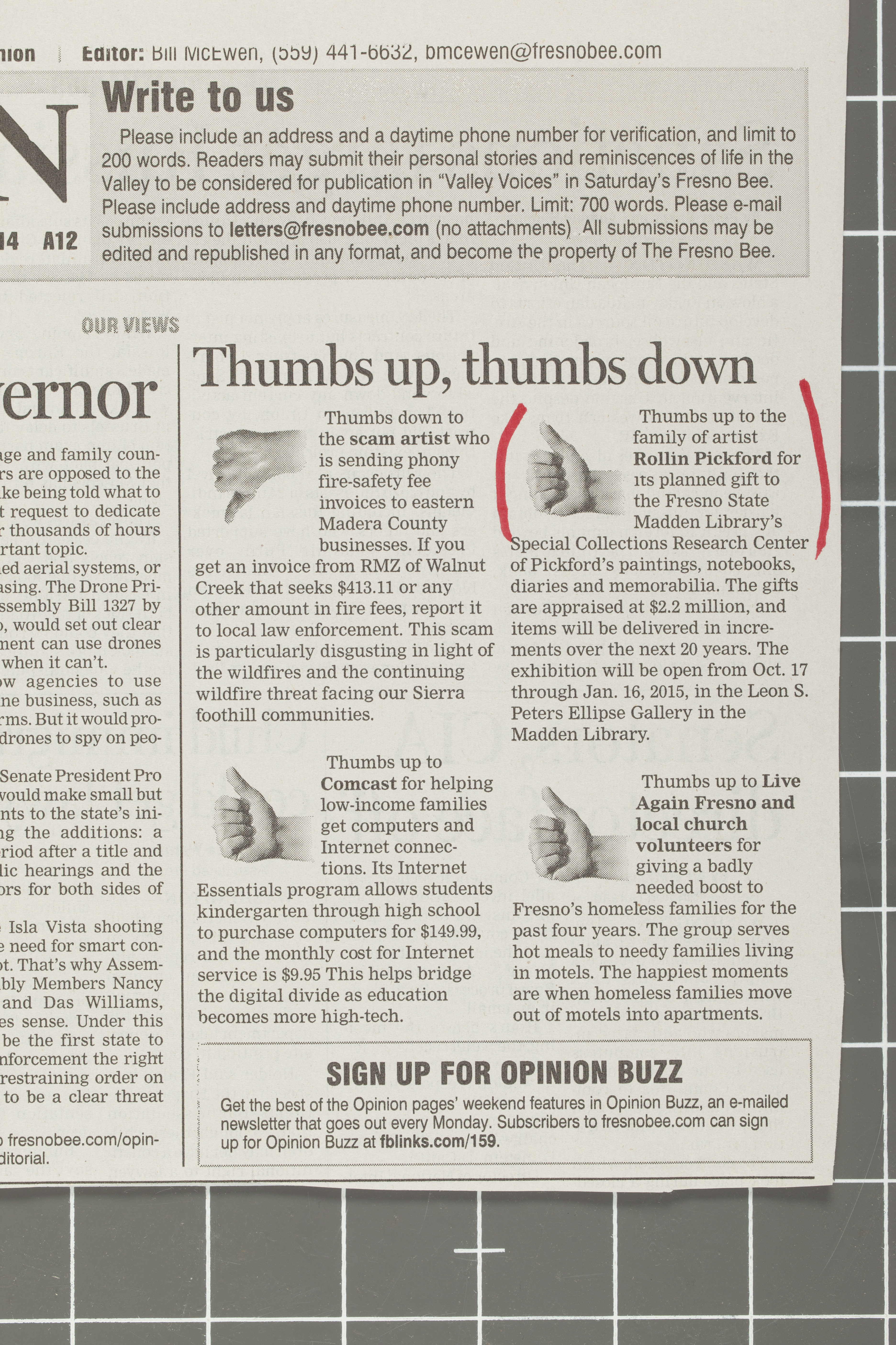 Bee editorial Praising Pickford Family Gift to Fresno State
