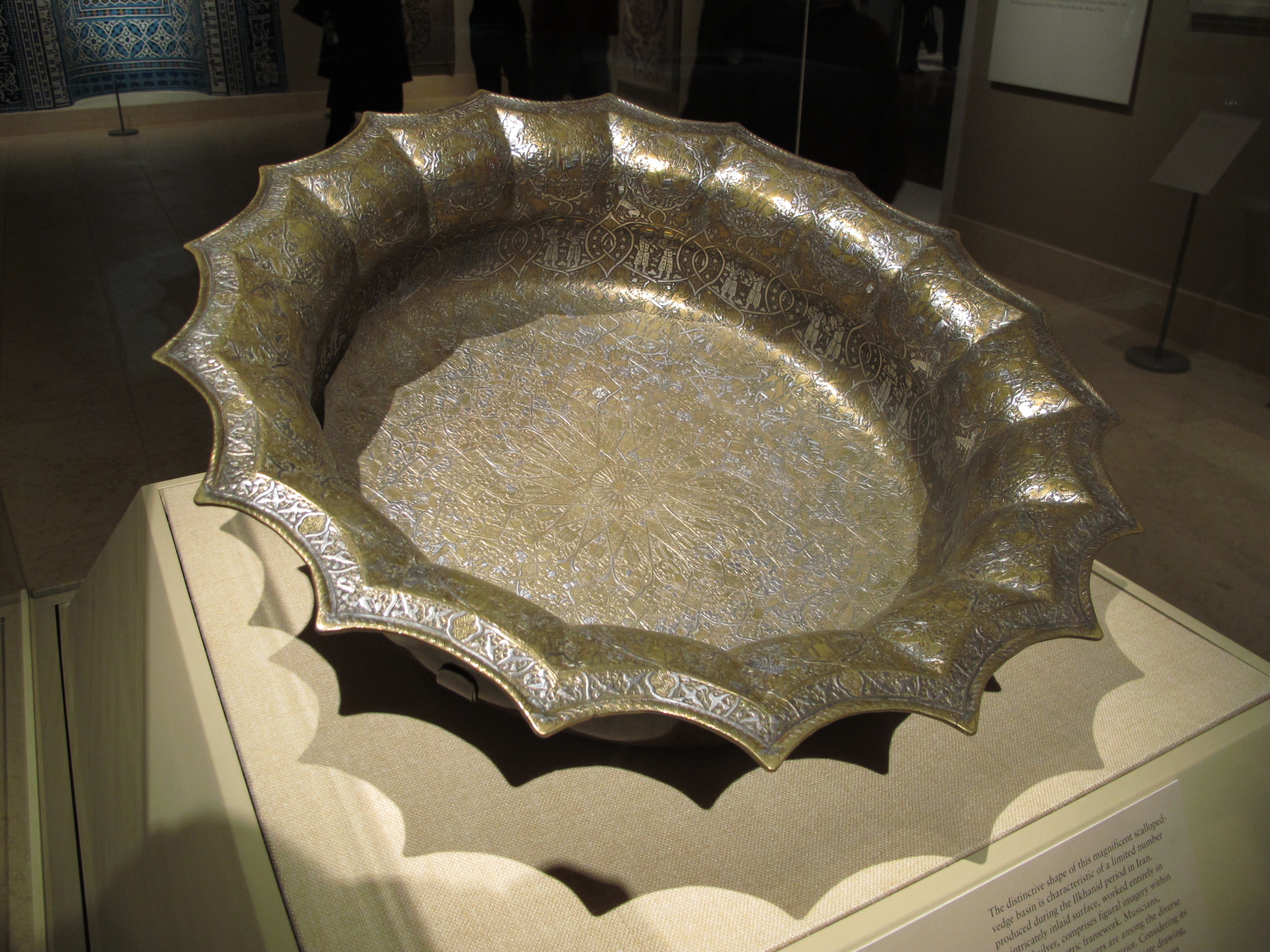 Raised, engraved brass with inlaid silver and gold