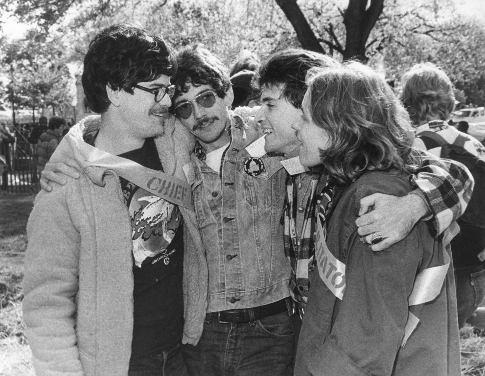 Photograph shows three men and a woman with their arms around each others shoulders at the National March on Washington for Lesbian and Gay Rights. The man, second from the left, wears a button that reads, "National March on Washington for Lesbian and Gay Rights".