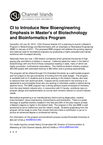 CI to Introduce New Bioengineering Emphasis in Master's of Biotechnology and Bioinformatics Program