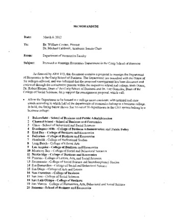 Proposal to reassign economics department to the craig school of business & recommendation to reassign department of economics to the craig school of business-department of economics faculty, college of social sciences, craig school of business.