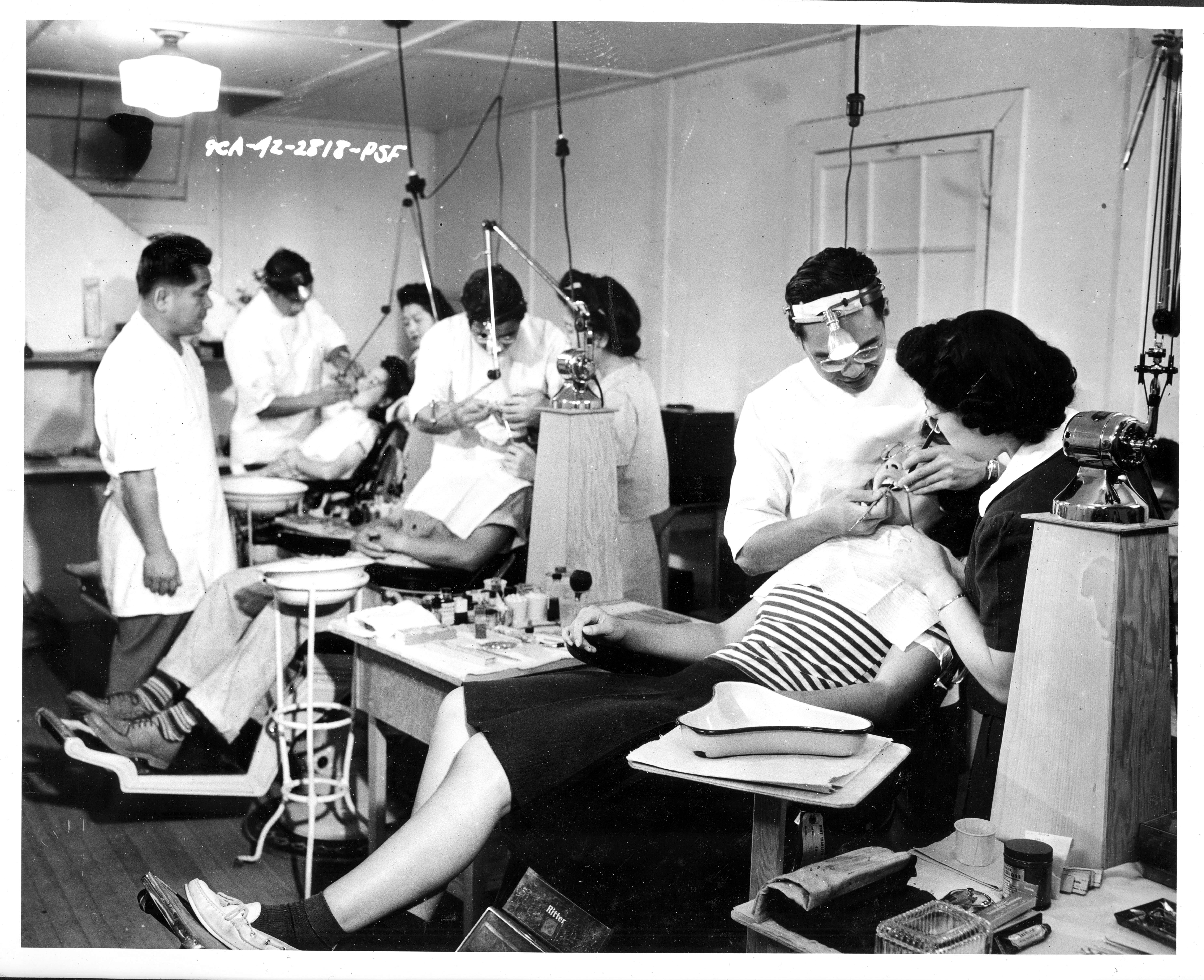 Photograph shows dental clinic at Portland, Oregon Assembly Center with evacuees being examined by Japanese dentists. The Portland Assembly Center was formerly known as the North Portland International Livestock Exposition Center.