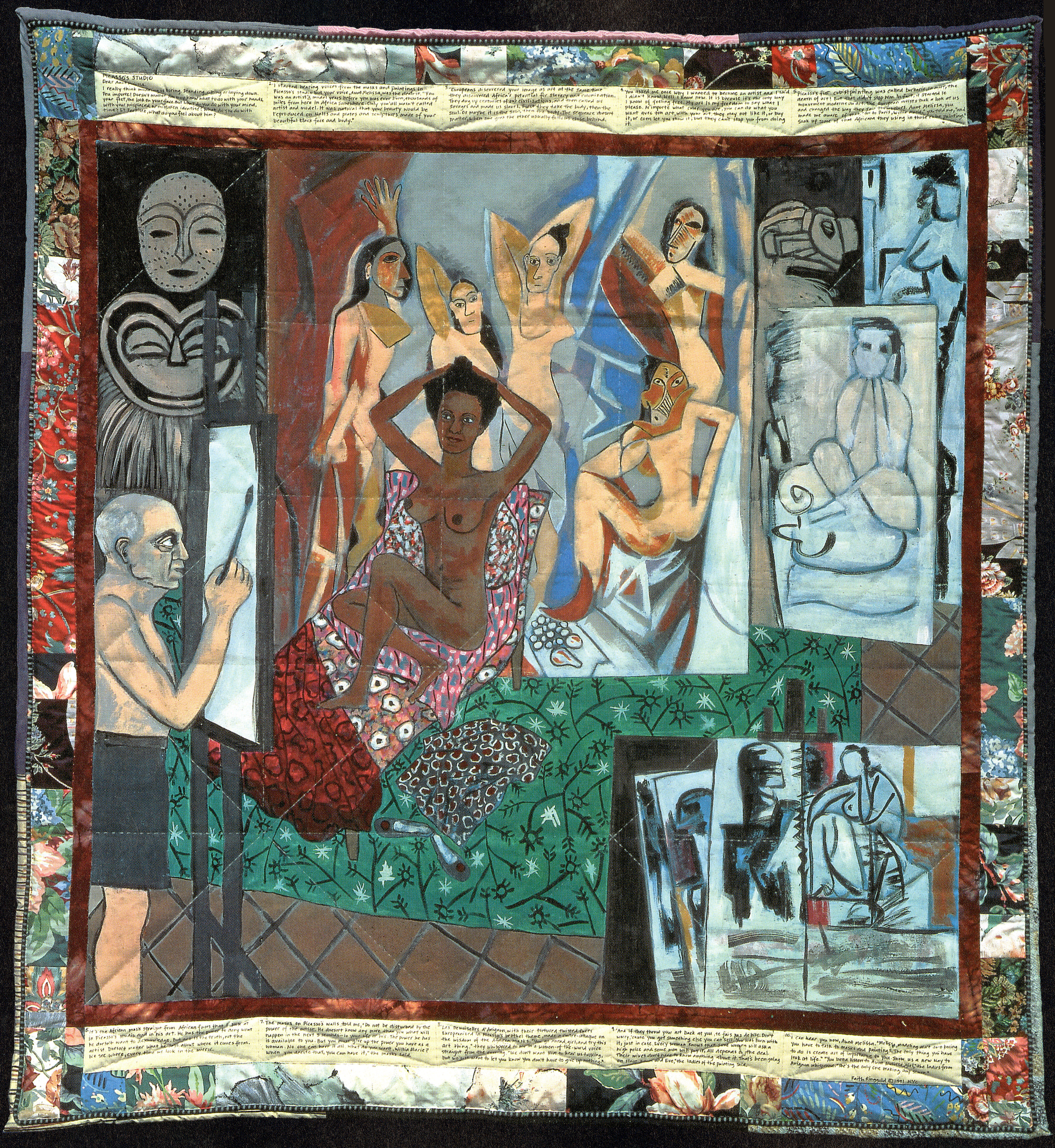 acrylic on canvas, printed and tie-dyed fabric