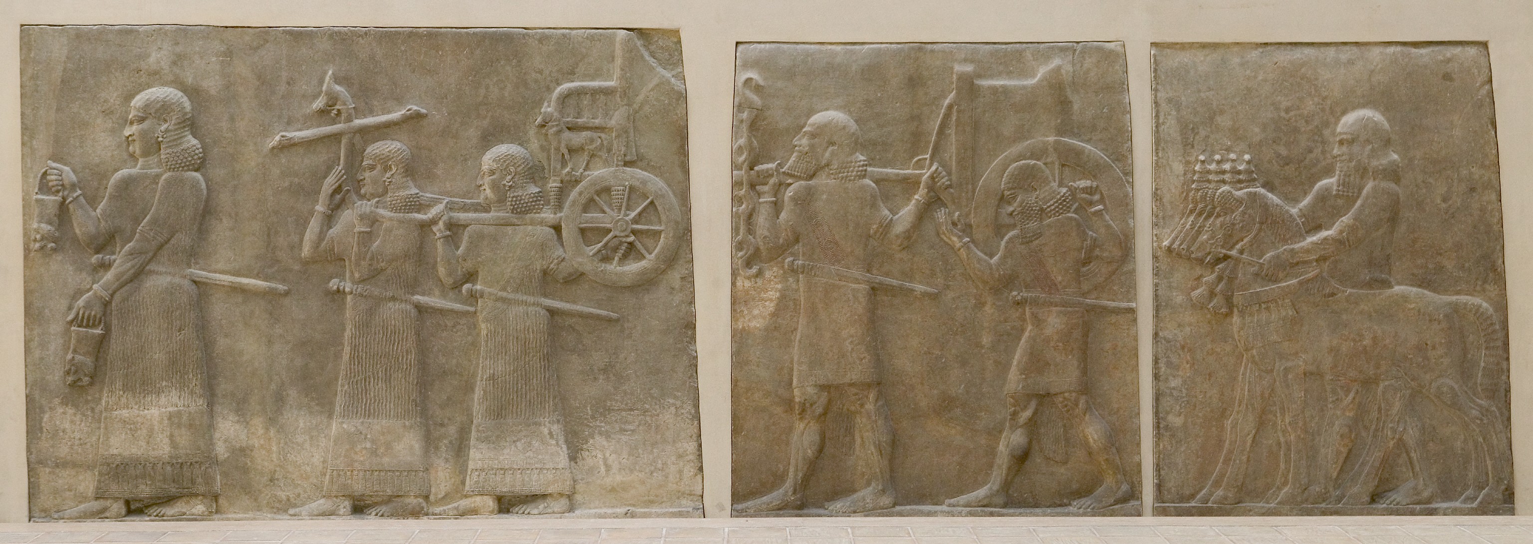View of three panels, including (center) retainers carrying portable throne and (right) leading the king's 4 chariot horses