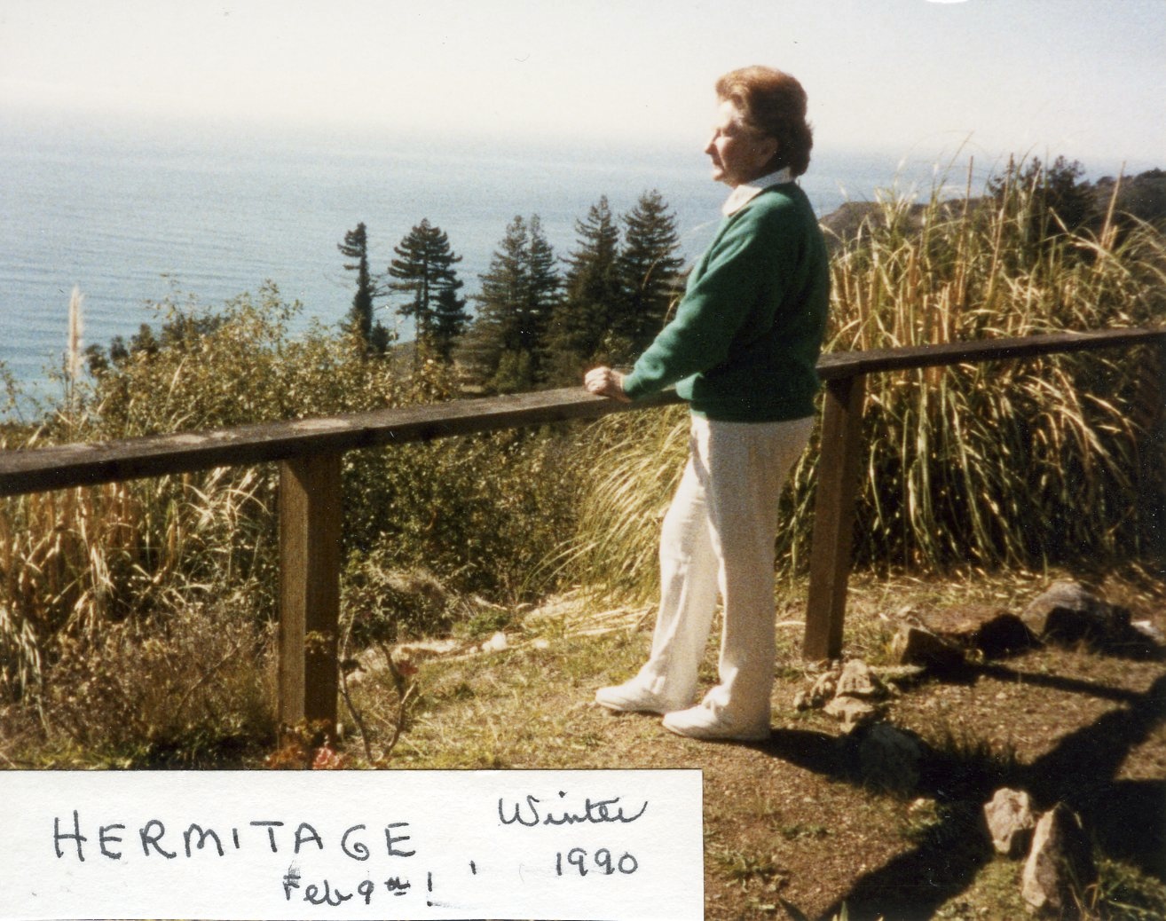 Image of Jean Harris overlooking the ocean in Hermitage, CA. February 9, 1990