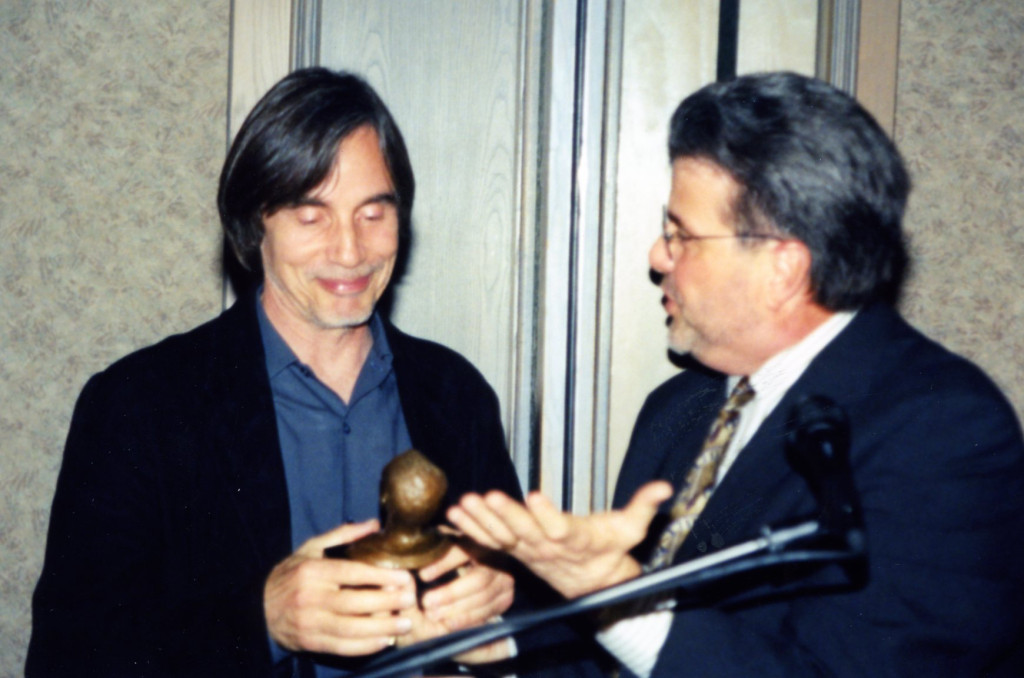 In the Souls of the People' award ceremony, 2002. Jackson Browne receiving award from San Jose State president Bob Caret. Original in Safe