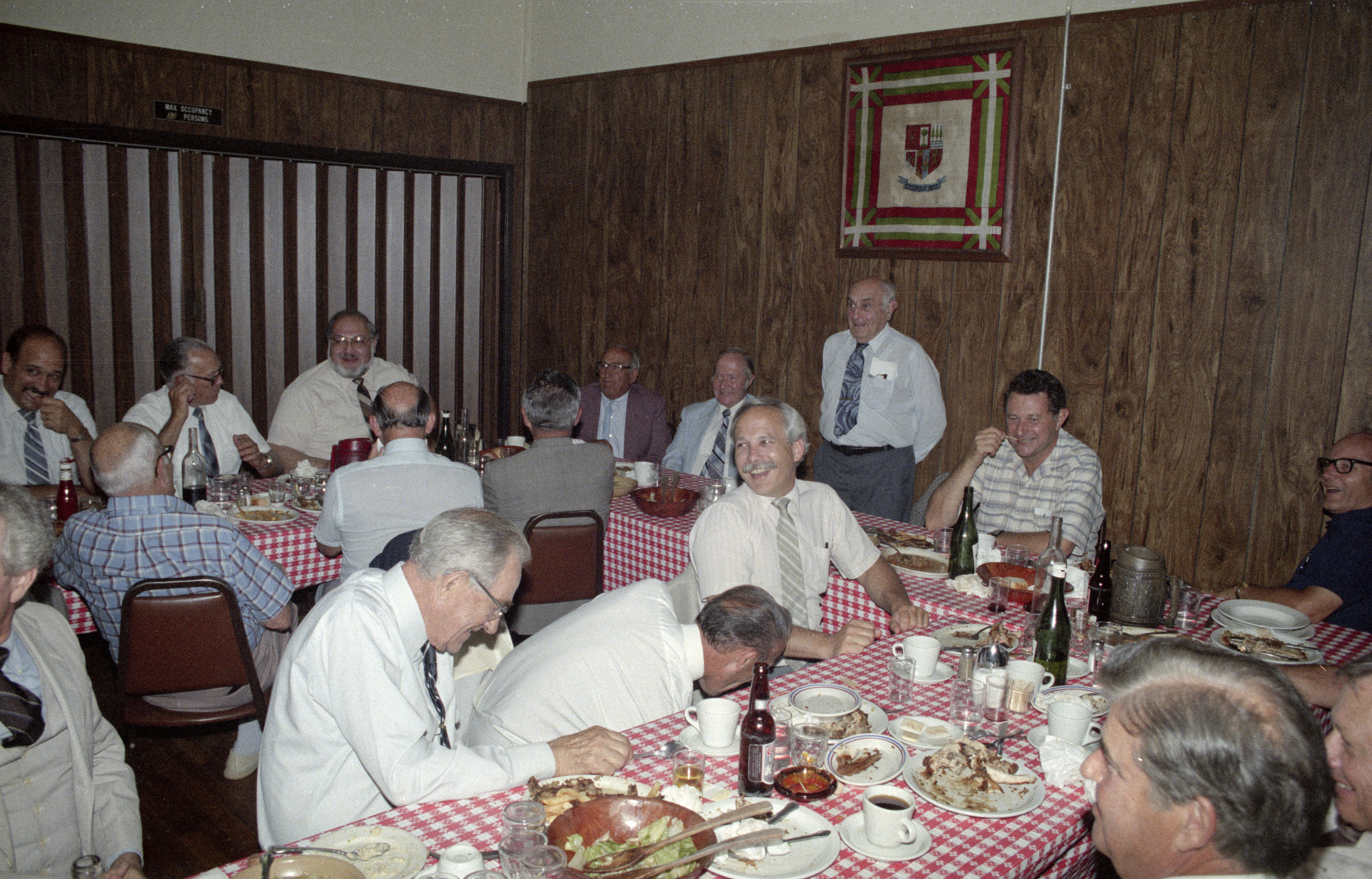 Bernard Witkin standing and talking; on left facing: ?, Justice Hollis Best, Judge Robert Mardikian, backside: Jim Barstow, Judge Leonard Meyers, Peter Morris; head table: Judge James V. Paige, Judge Frank Creede, Jr., Bernie Witkin, Judge Robert Coyle, James Gregory; seated close: Judge Harold Thompson, Justice Charles Hamlin, Judge Gene Gomes; Judge Milo Popovich in bottom right corner.