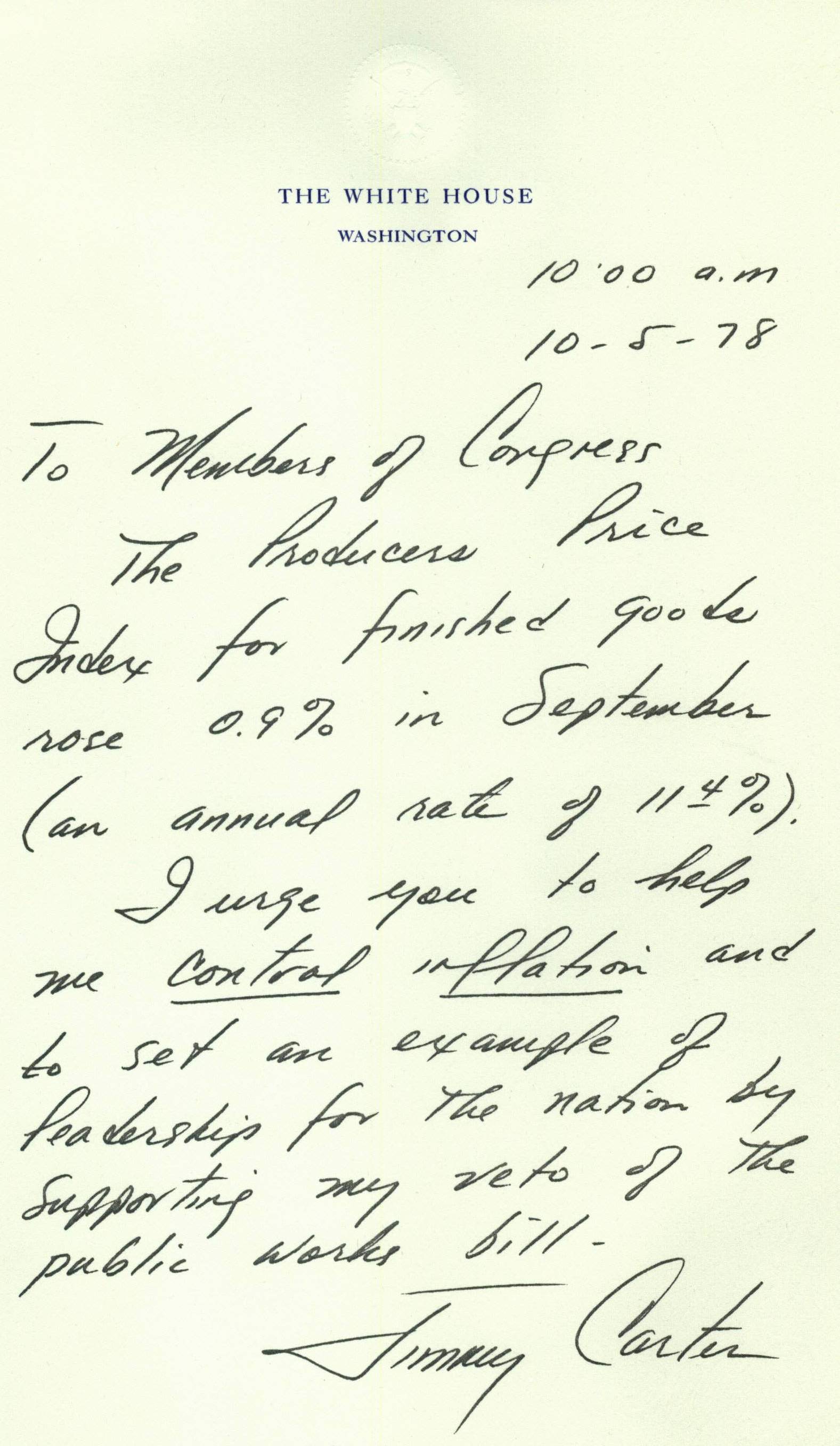 Letter to Congress from President James ("Jimmy") Carter re: Inflation