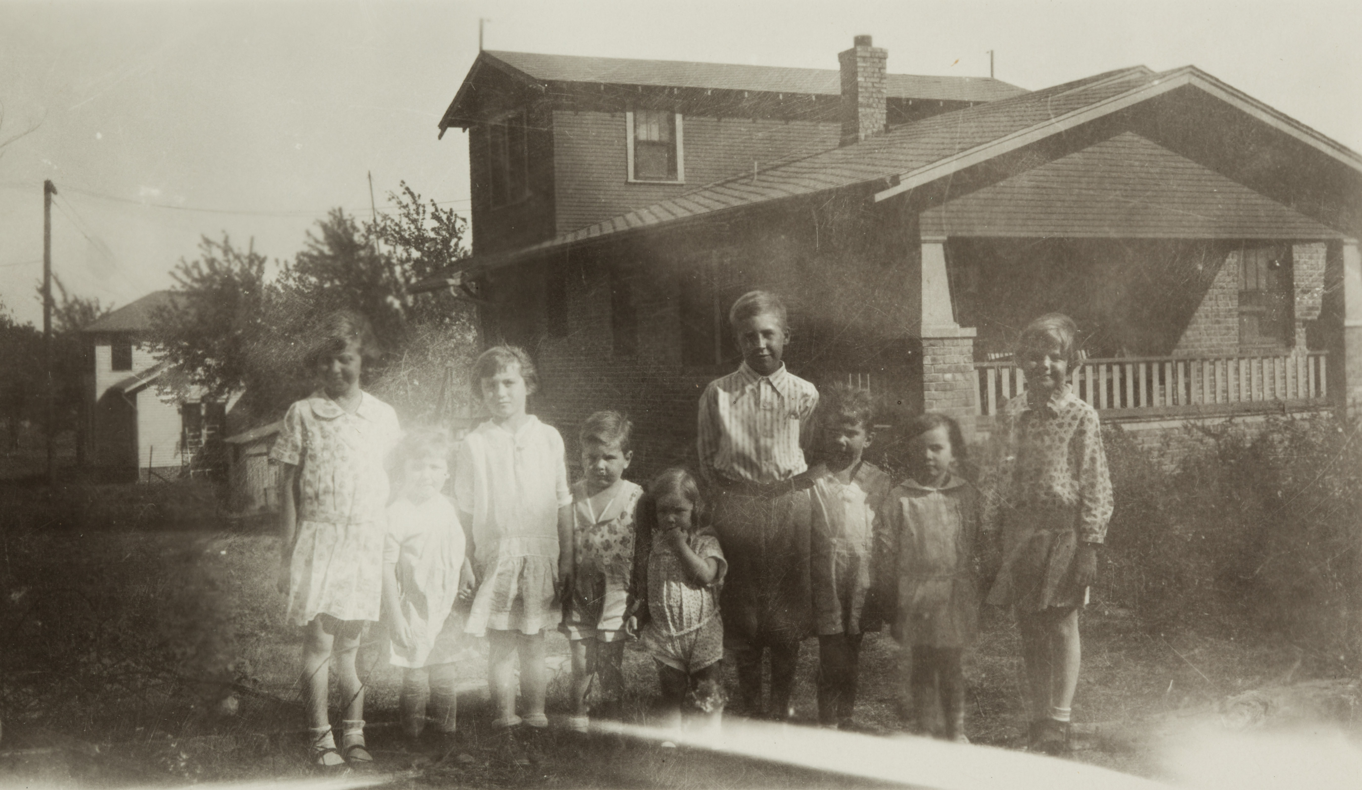 Glenna, about age 10, with siblings and neighbors at the family house in Fort Scott, KS. L_R: Glenna, two unidentified neighbor girls, Keith, Vaughn, Lloyd, Elwyn James, unidentified neighbor girl, Eloise.