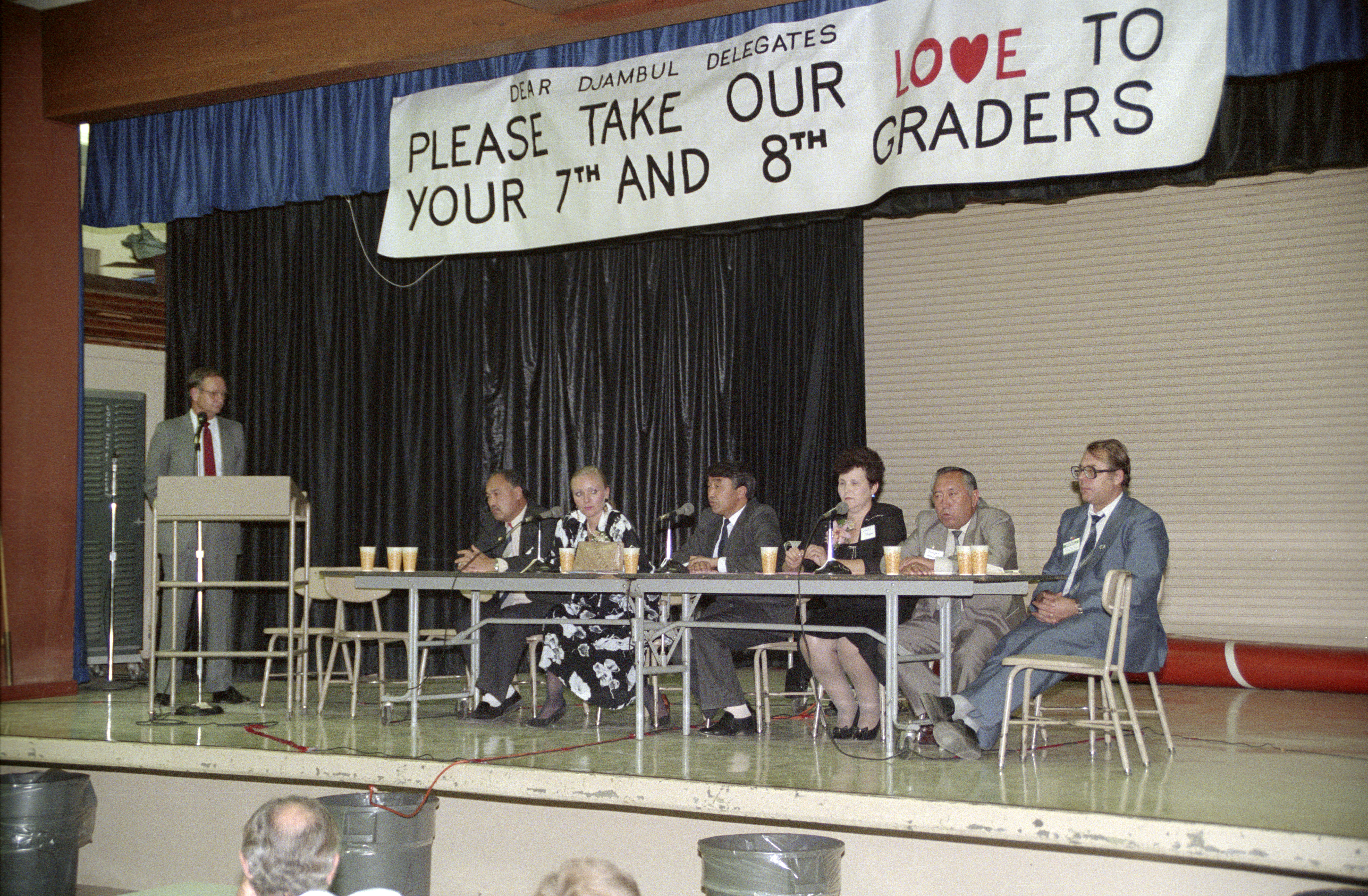 Djambul Mayor and others at onstage table; Banner "Dear Djambul Delegates: PLEASE TAKE OUR LOVE TO YOUR TH AND 8TH GRADERS"