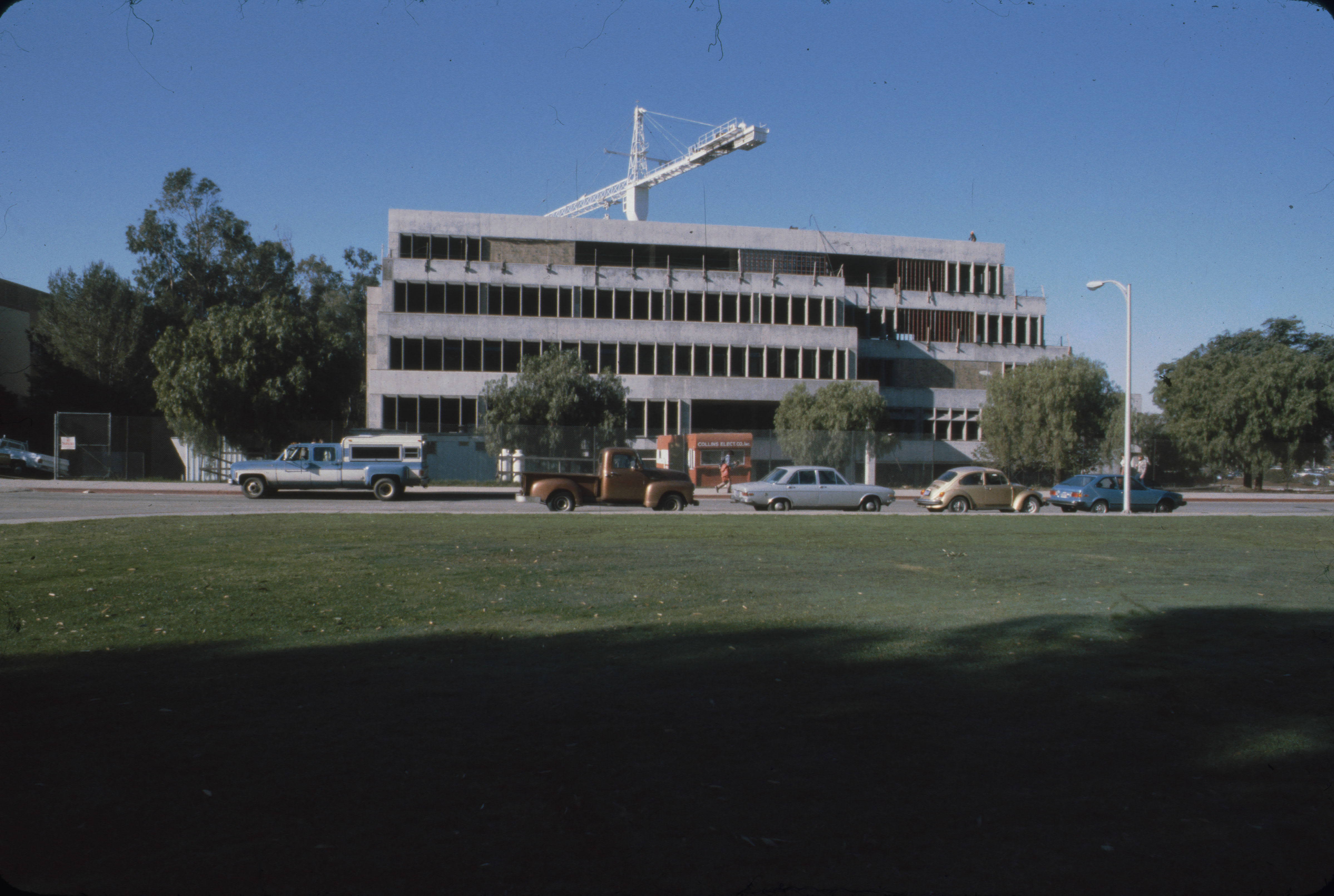 View of Kennedy Library while under construction, from the lawn across from the main entrance. Cars and pedestrians line the street in front of the building. All five floors are pictured, with the crane in view.