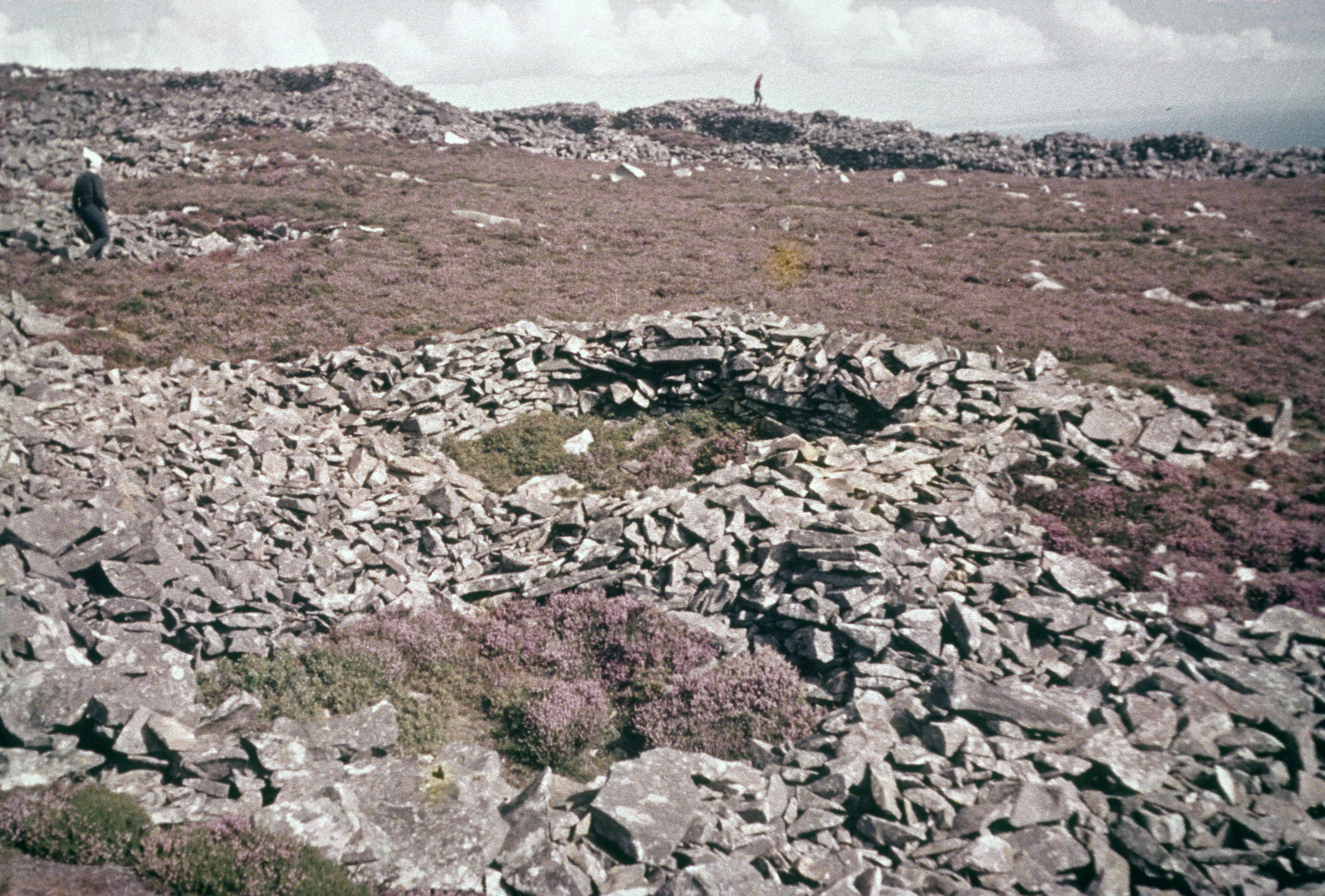 The life of Celtic Tribes continued well into the period of Roman occupation. It seems as if there was no interference with native life, and that apart from the maintenance of peace and the collection of taxes, the earlier Iron Age cultures continued. This example of a walled hilltop village is one of a group of such settlements in North Wales, which were occupied until the second century C.E.; it contains the remains of a number of round dry stone huts within built-up acropolis.