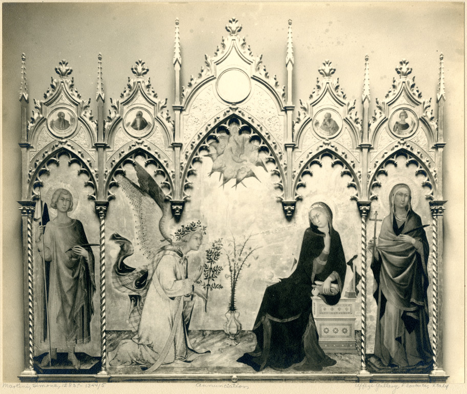 This image depicts an Annunciation altarpiece, from Siena Cathedral, 1333 (frame reconstructed in the 19th century). Tempera and gold leaf on wood, center panel 10′ 1″ X 8′ 8 3/4″. Galleria degli Uffizi, Florence (1283? - 1344/5).