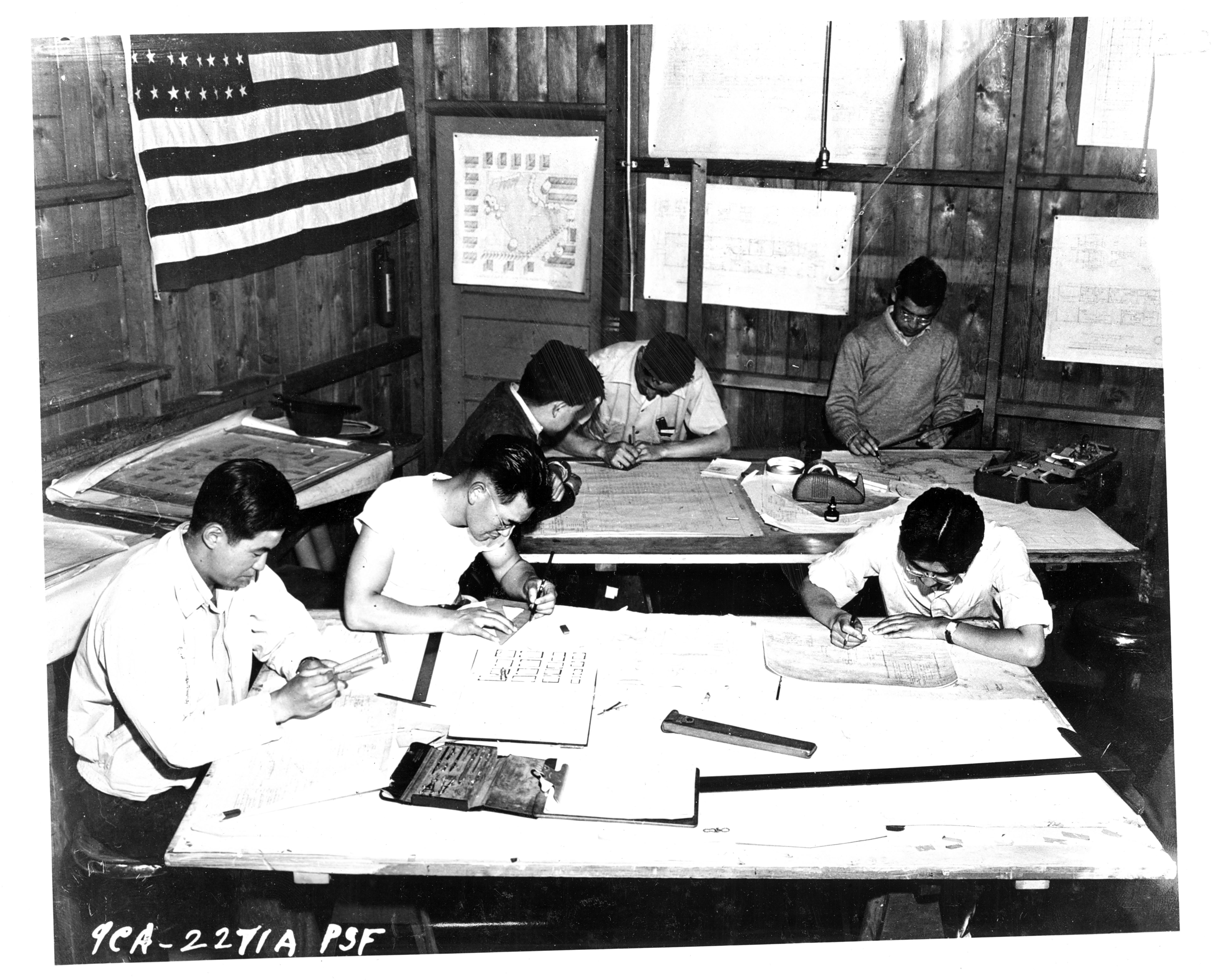 Photograph shows a group of evacuees busy in a drafting room of an assembly center.