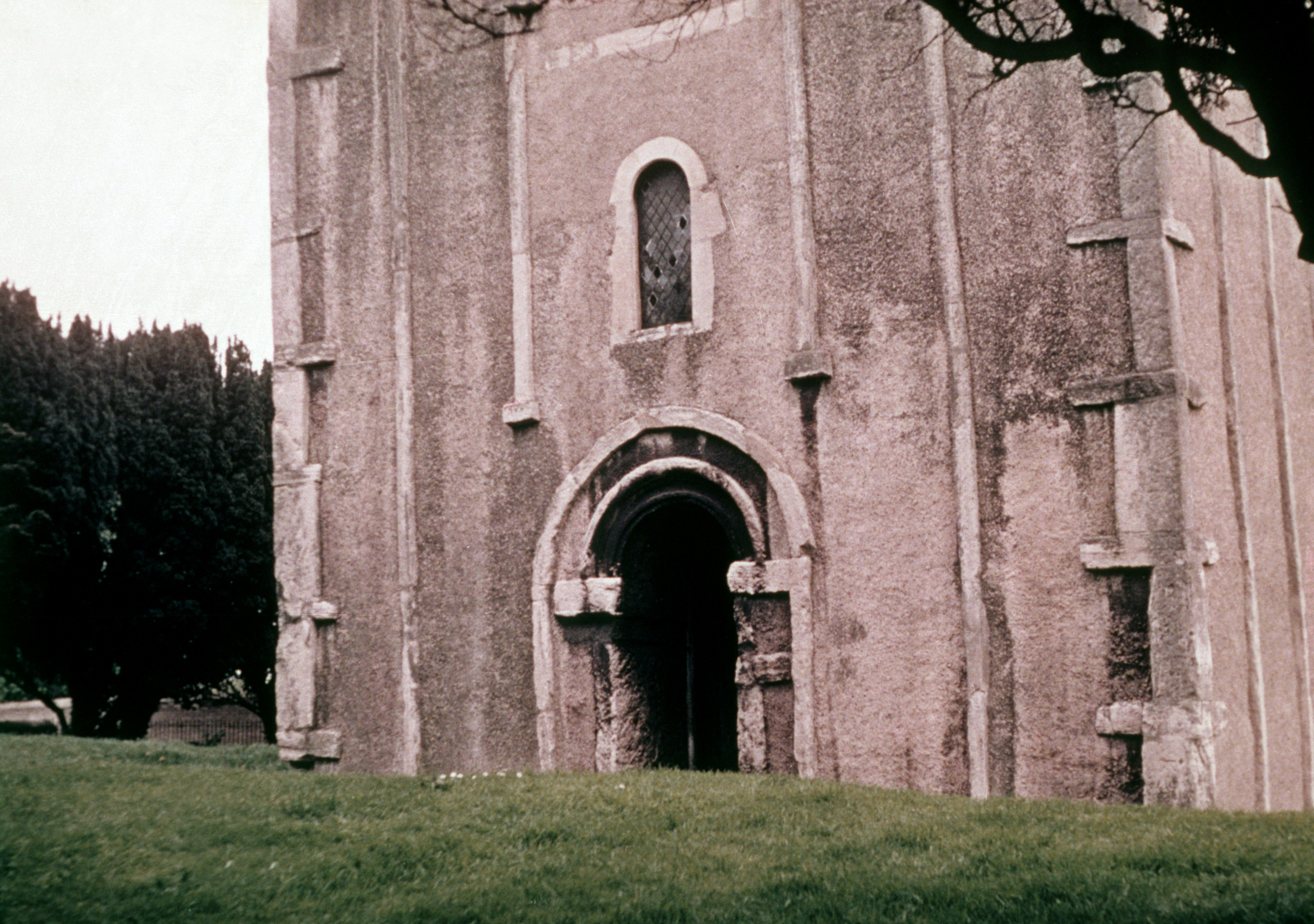 The semicircular arched doorway, with block capitals arranged at the springing of the arch, is also essentially a simple Saxon-Romanesque form, which relies on its geometry and has no added decoration. The long and short stone corner detail can also be clearly seen.
