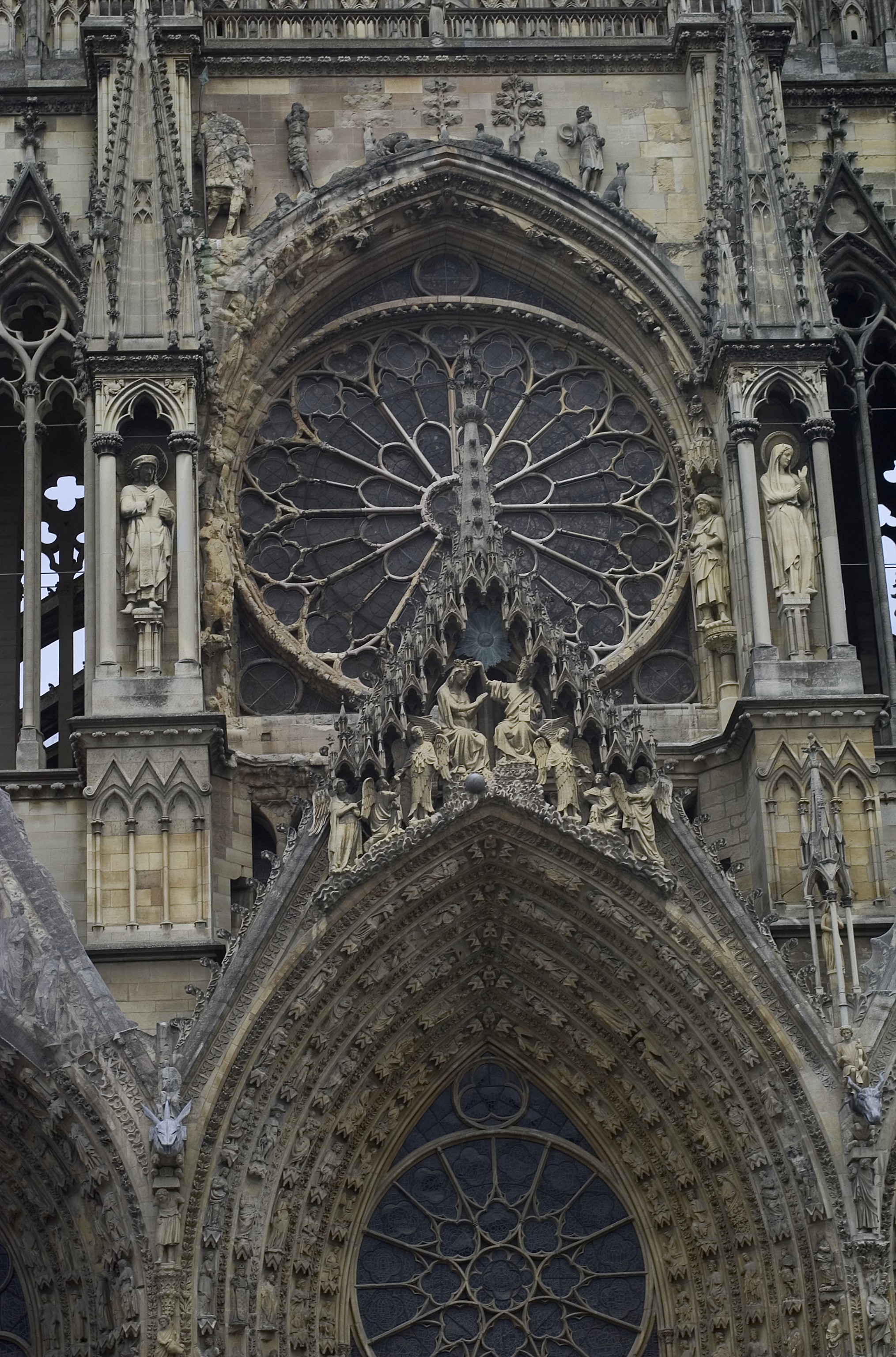 Closer view of sculpted gable and archivolts of Central portal of West façade, with Rose window behind