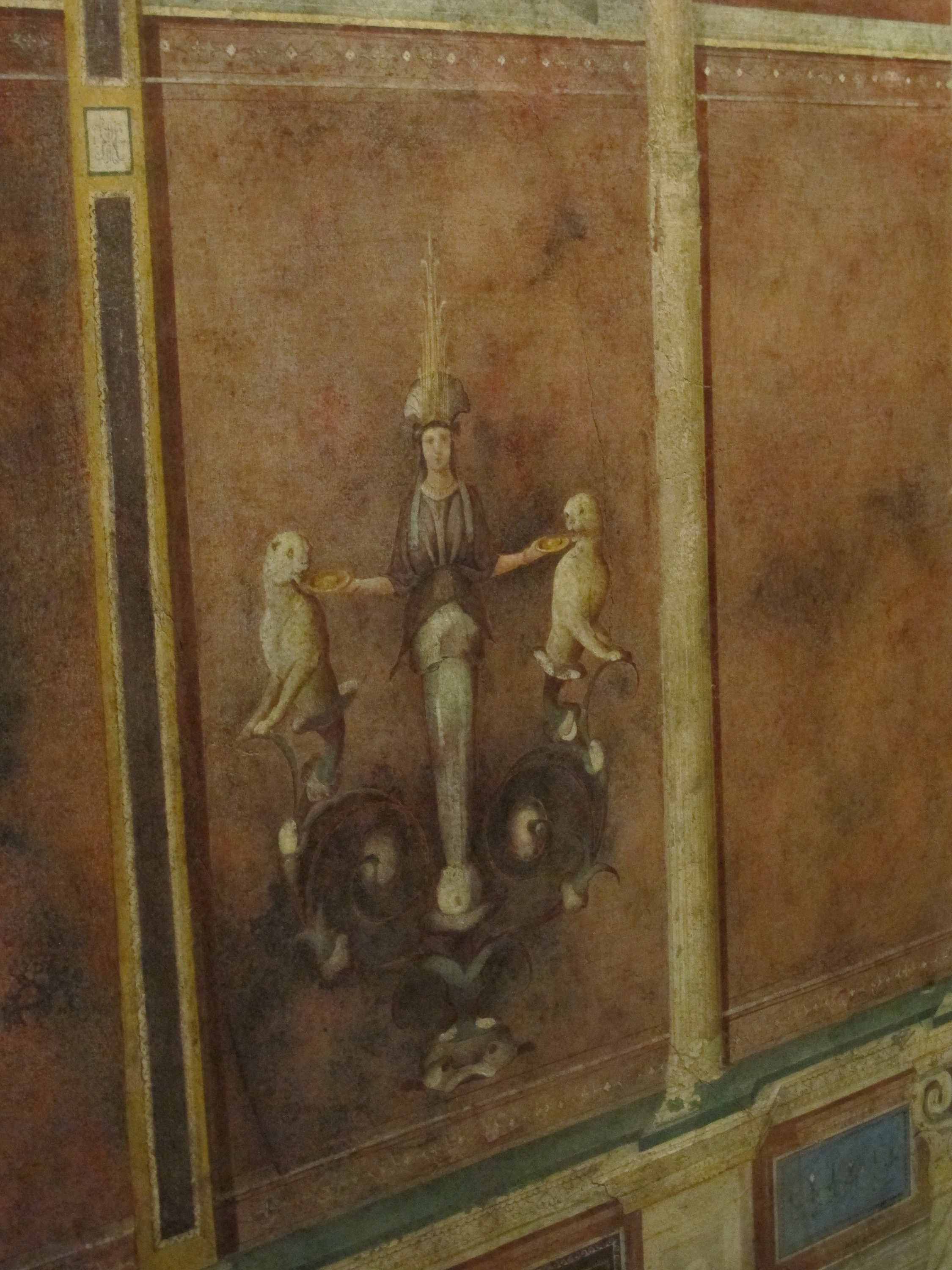 Architectural elements, representations of pictures, and ornamental figures are painted on the walls. The "dominant color is the expensive cinnabar red."
