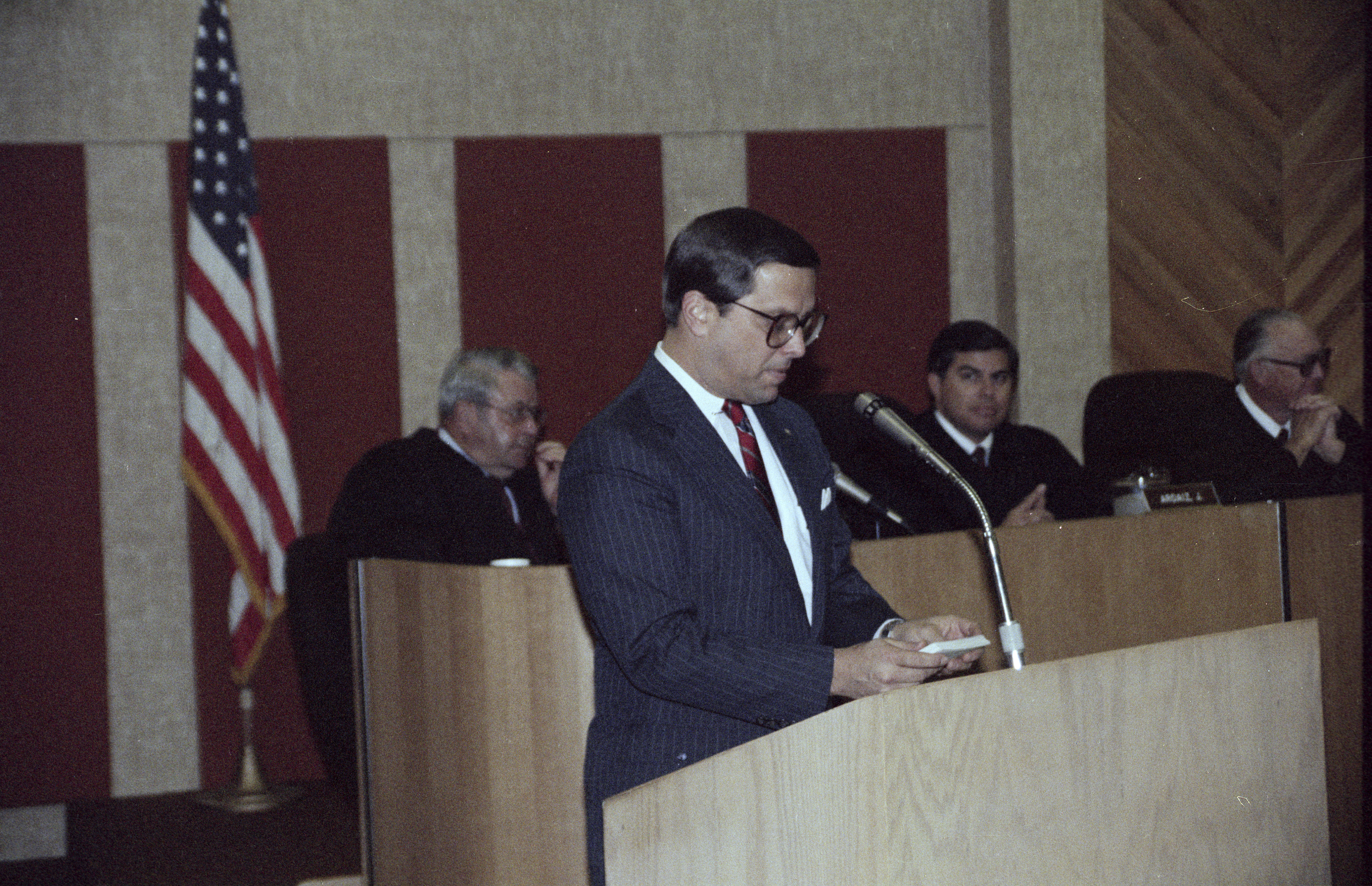 State Bar District 5 Governor Robert Oliver reading names of new attorneys to be admitted Seated: U.S. District Court Judge Dean Price and Justices James Ardaiz and Hollis Best