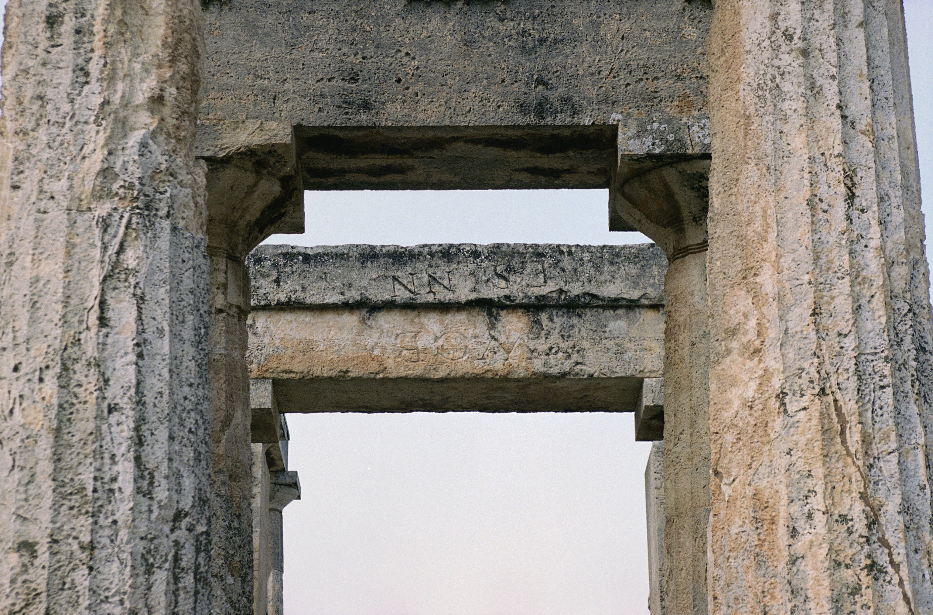 View into Naos through central columns of E façade with view of interior architraves