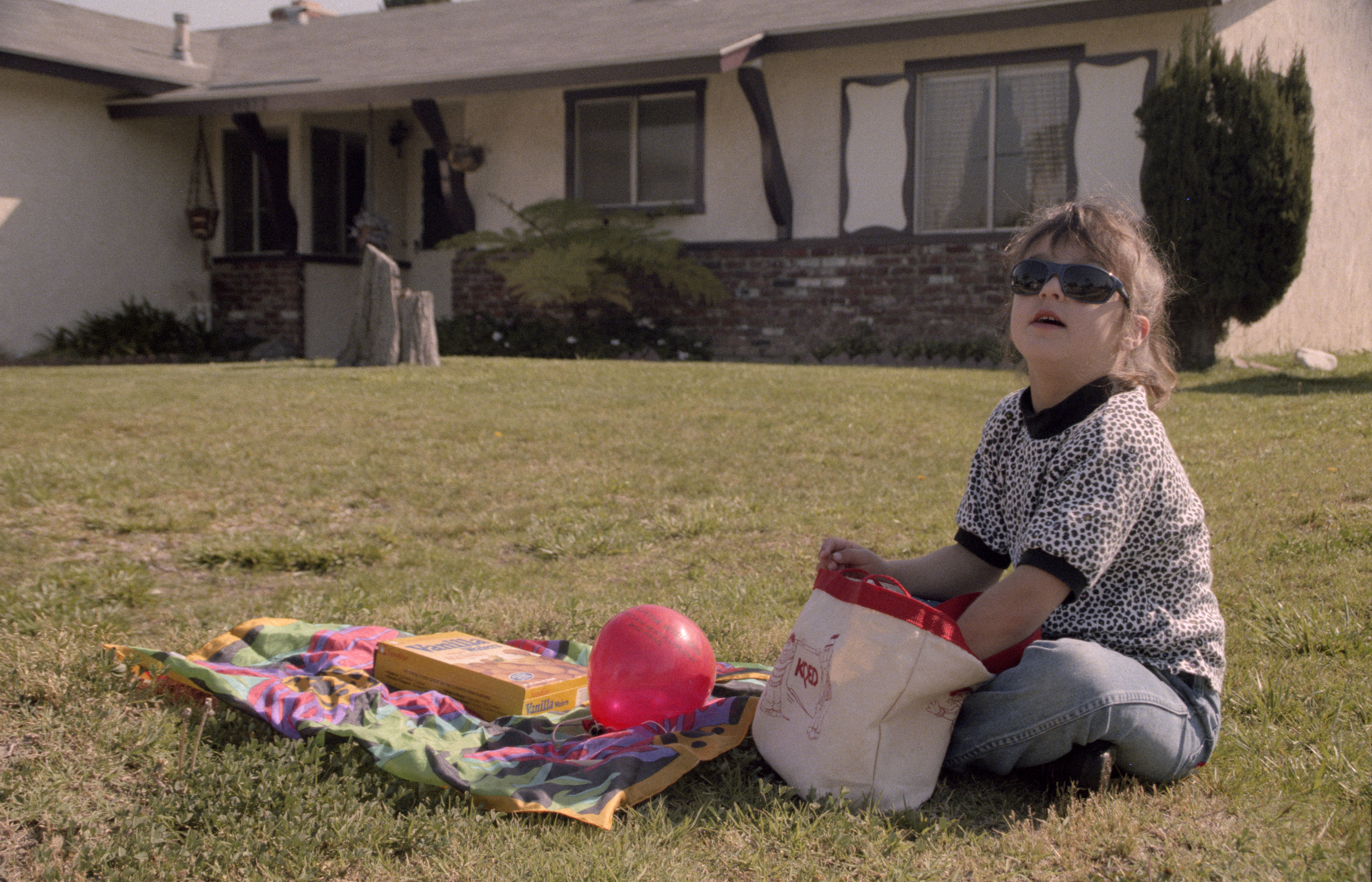 Robin Watkins wearing dark sunglasses on front yard at Rose O'Reilly's home at 10952 Tonga Lane, Huntington Beach