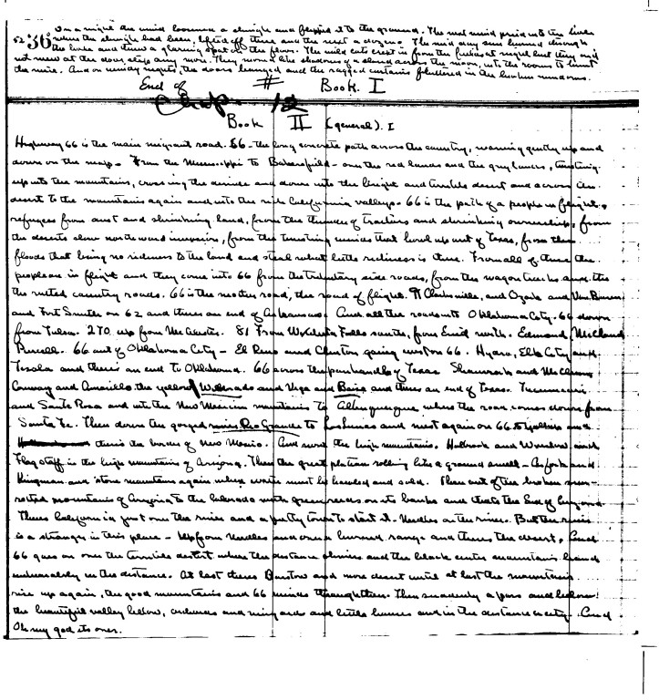 Steinbeck's handwritten ledgerbook manuscript page of The Grapes of Wrath. The words portray Steinbeck's description of Route 66. RESTRICTED USE