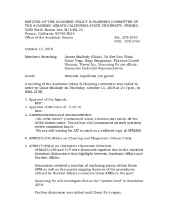 Minutes of the Academic Policies & Planning Committee 10/13/2016