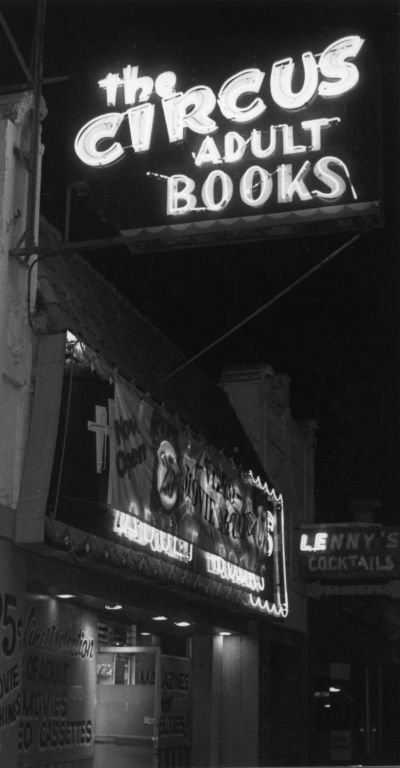 External view of Circus Adult Books on South First Street in San Jose at night. A lighted neon sign is visible above the entrance and Lenny's Cocktails is in the background.