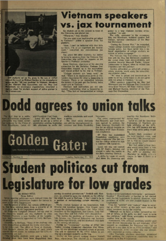 The Gater for the Fall 1966 - Feb 1972 was published daily during the regular academic year and weekly during the summer by the Board of Publications for the Associated Students of San Francisco State College. This student newspaper was edited by Diran Karaguezian with managing editor Dave Richmond, city editor Greg de Giere, and photo editor Hank Smith. The Daily Gater spotlighted campus news and events and includes advertisements. Best copy available