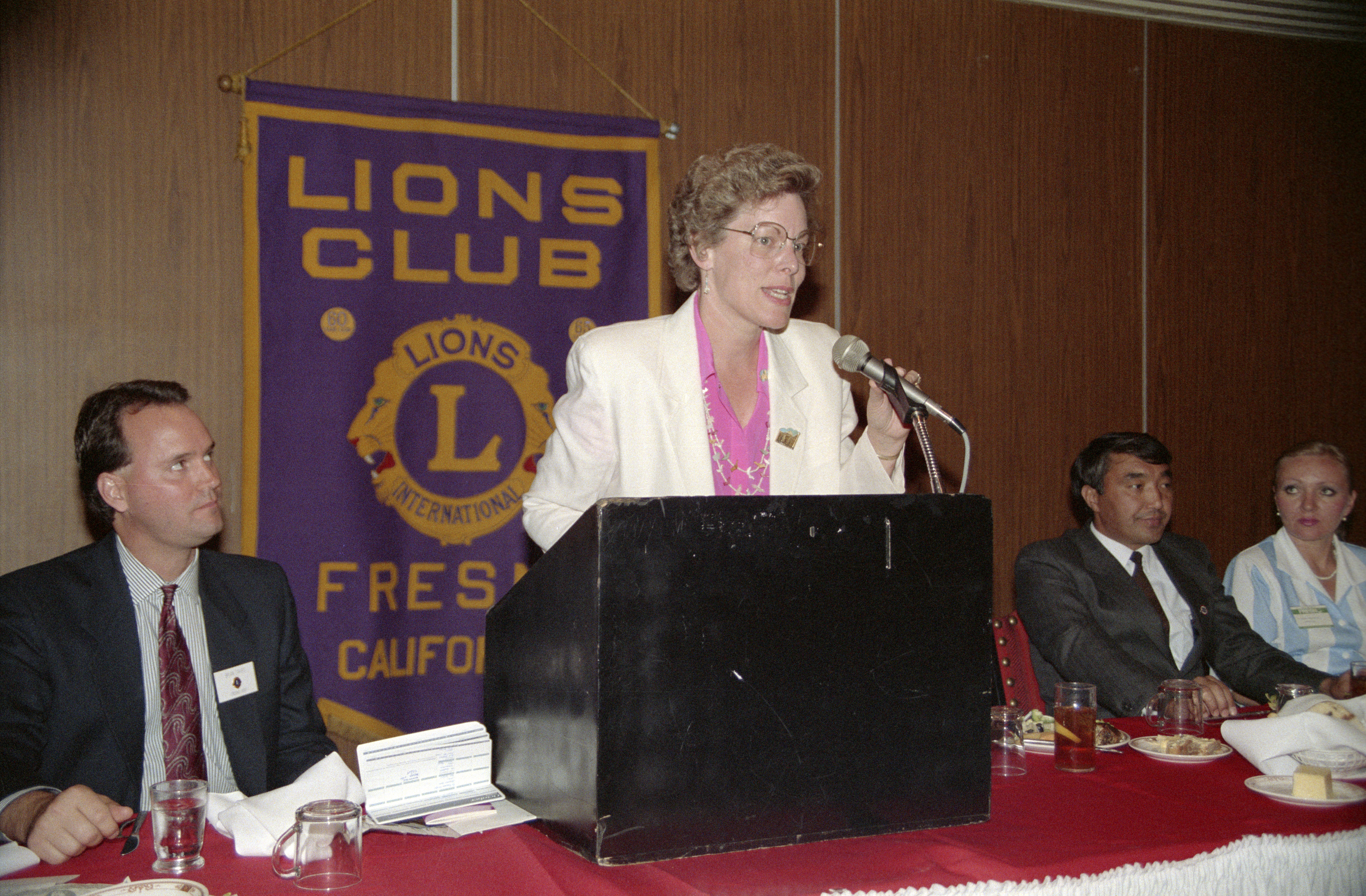 Fresno Mayor Karen Humphrey speaking at lectern; Lions Club gold on dark blue banner on wall behind her