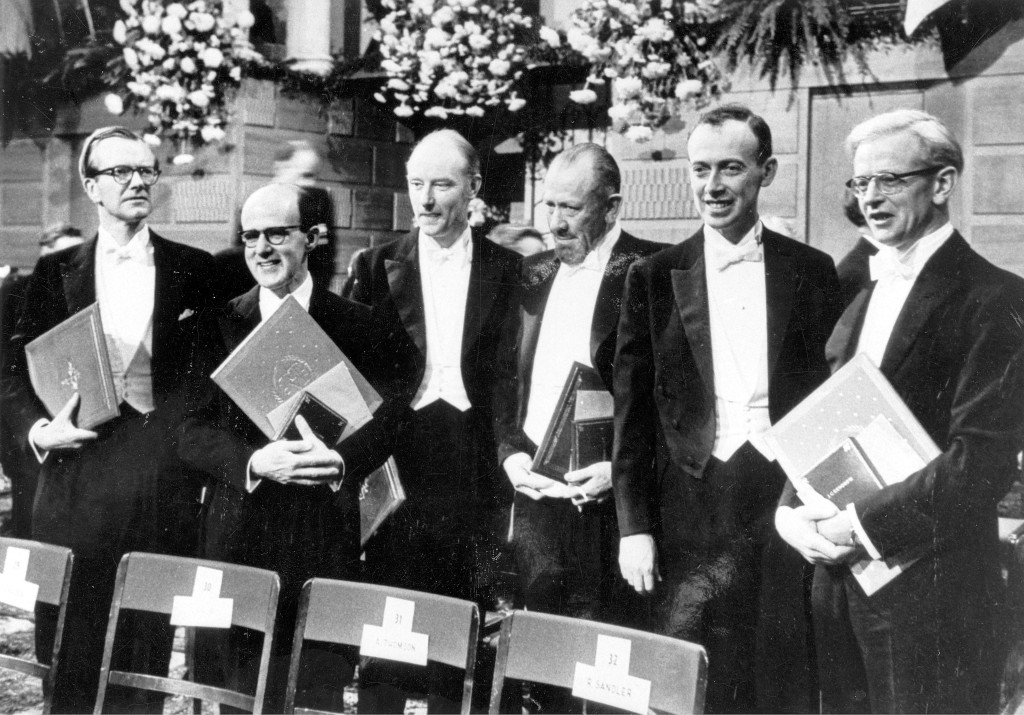 Nobel prize laureates Maurice Wilkins (medicine), Max Perutz (chemistry), Francis Crick (medicine), JS (literature), James Watson (medicine), John Kendrew (chemistry). Digital copy only. No hard copy.