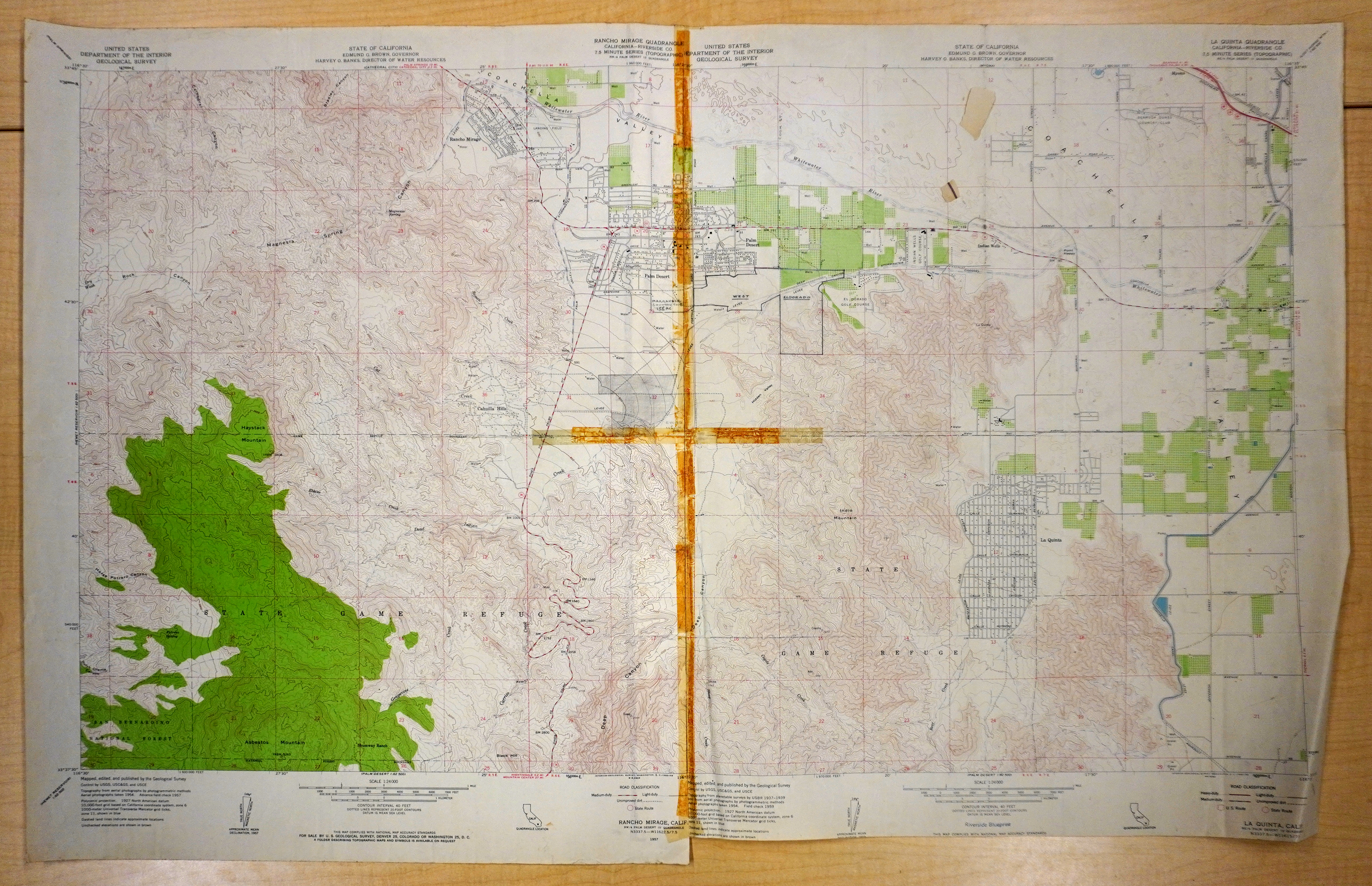 Two different U.S. Geological Survey maps taped together vertically (one for the Rancho Mirage quadrangle, and the other fort the La Quinta quadrangle). There is a long piece of adhesive tape holding the 2 maps together, and an additional strip of adhesive tape running horizontally.
