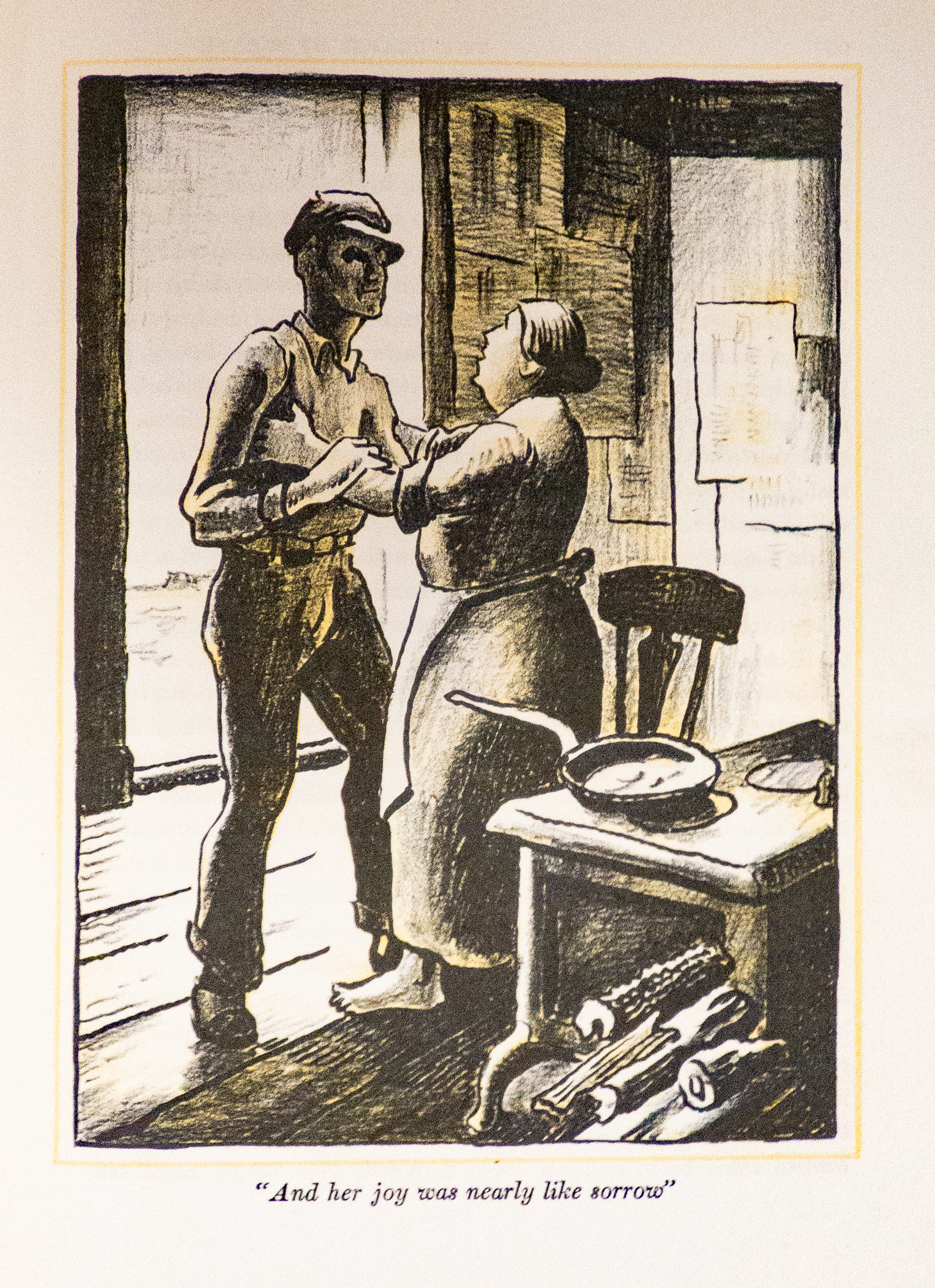 Illustration of Ma Joad as she greets Tom as he arrives home, from The Grapes of Wrath, vol.1 p.91, illustrated edition, by Thomas Hart Benton, a native of eastern Oklahoma, who was assigned to draw archetypal Oklahomans for 20th Century Fox as the studio believed that would make the casting more accurate. "And her joy was nearly like sorrow." "She closed her eyes. 'Thank God,' she said, 'Oh Thank God!' And suddenly her face was worried. 'Tommy, you ain't wanted? You didn't bust loose?' 'No, Ma. Parole. I got the papers here."'
