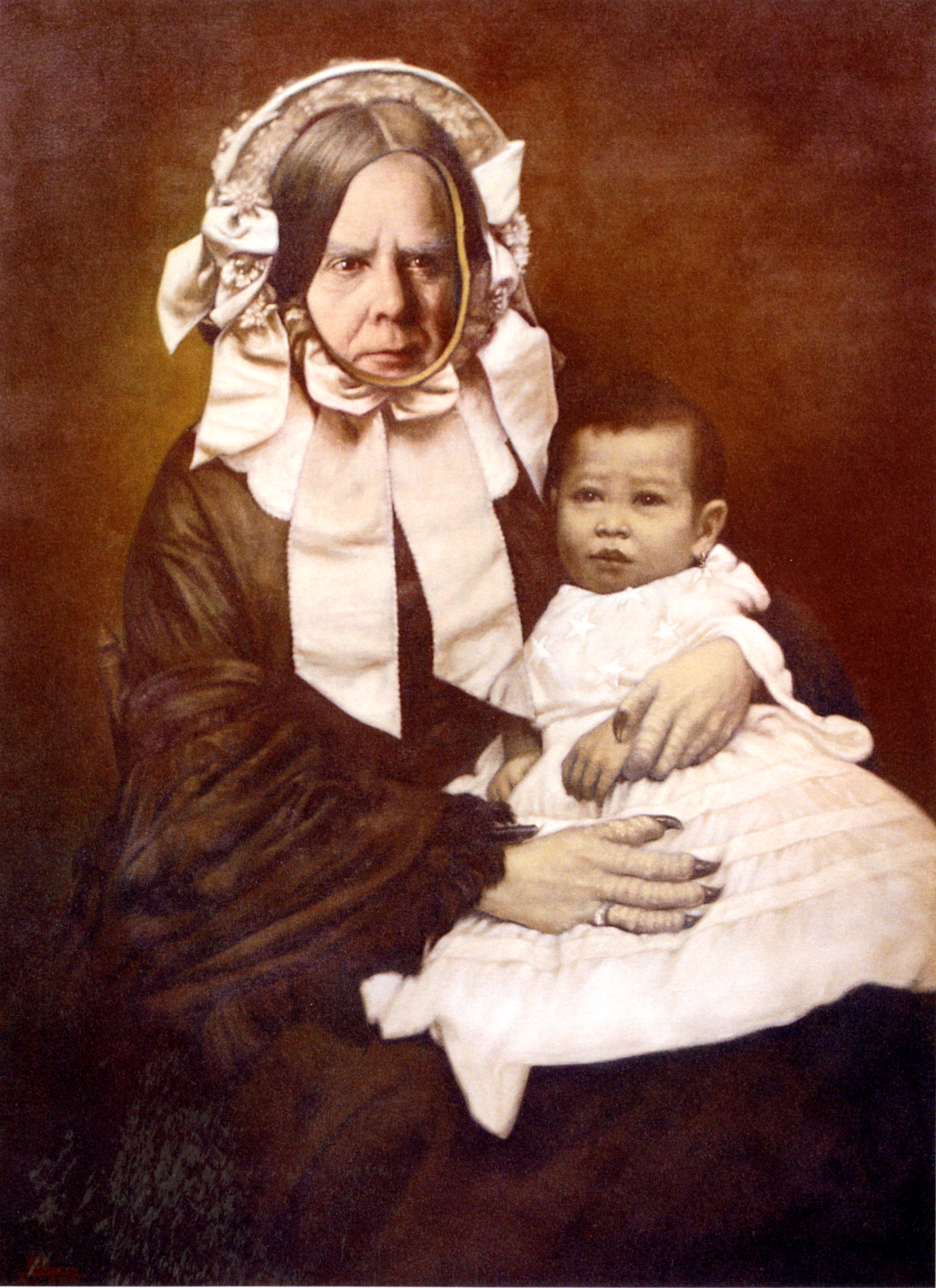 Oil on canvas. Depicts President McKinley with Filipino baby on lap.