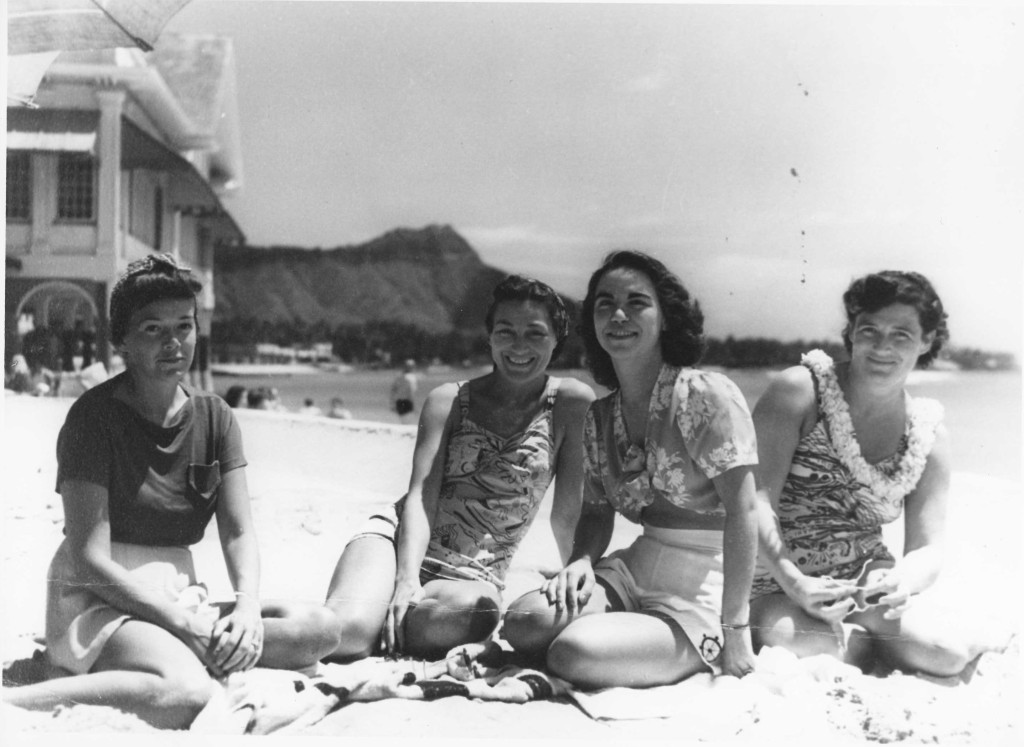 Carol Steinbeck (far right) and 3 women at the beach. Carol's sister Idell is possibly at far left.
