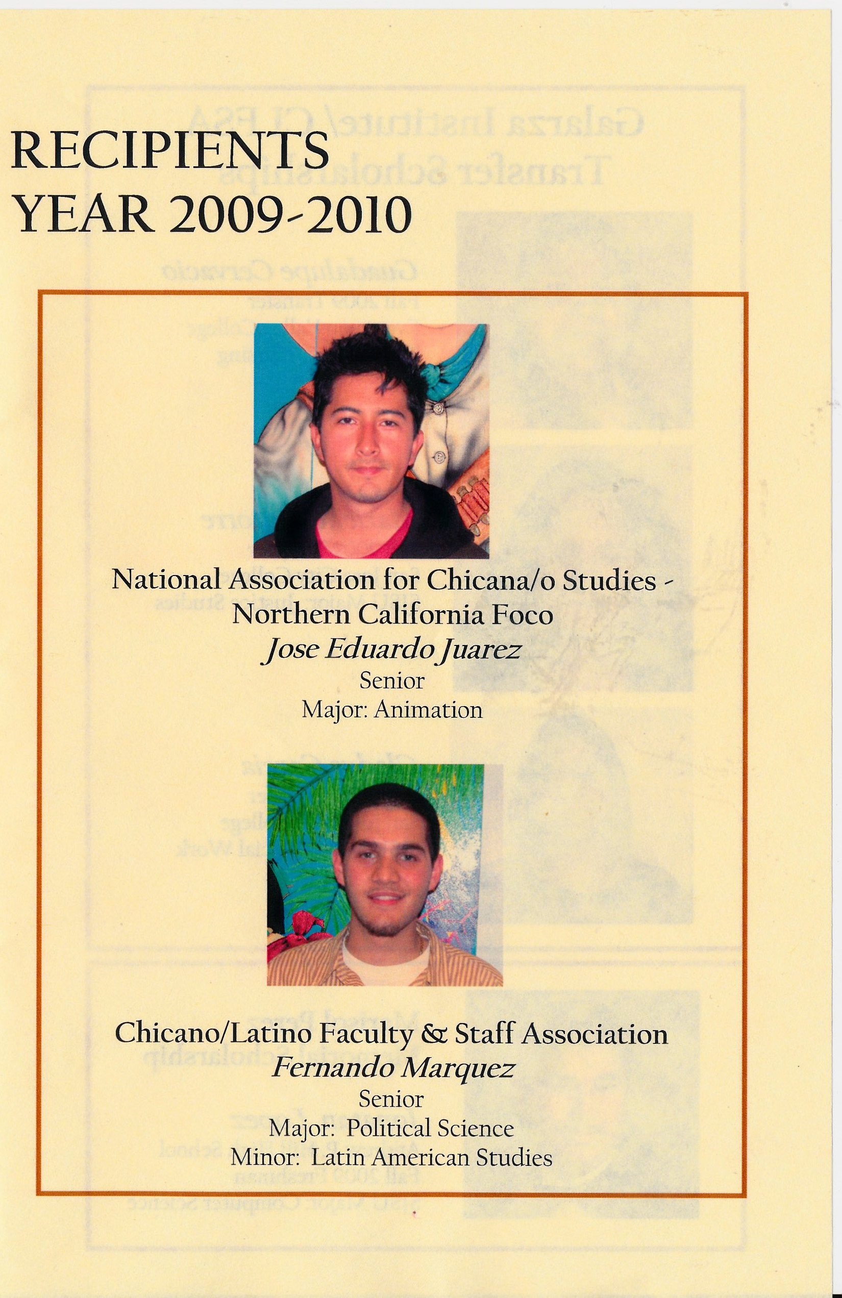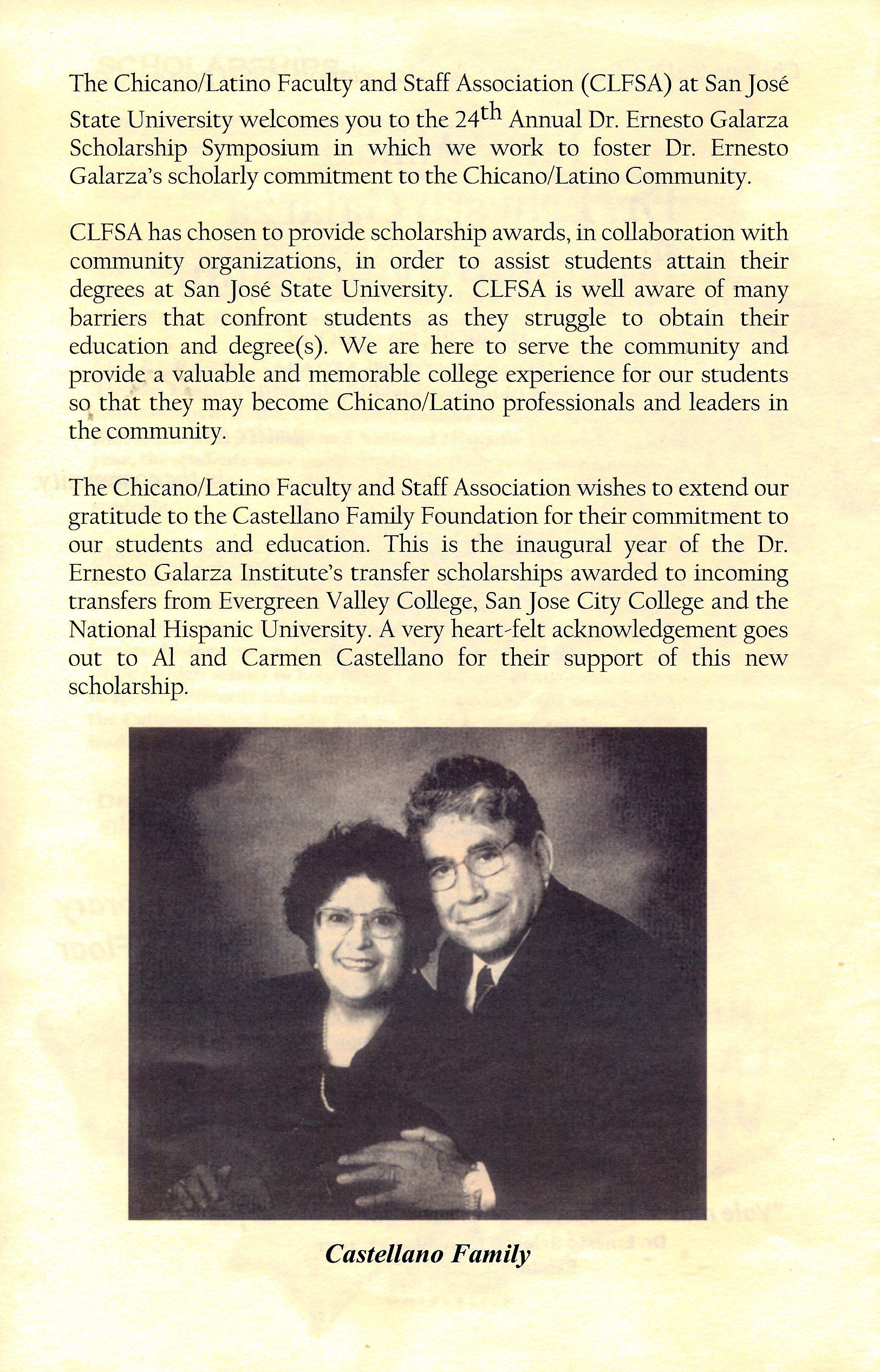 Program for the 24th Annual Dr. Ernesto Galarza Scholarship Symposium, held at San Jose State University on Wednesday, May 6, 2009 at 6:00 PM – 8:00 PM in the Dr. Martin Luther King, Jr. Library Cultural Heritage Center. The event included a Registration/Reception, Welcome/Opening Remarks by Dr. Julia Curry (President, CLFSA), Presentation of Scholarships by Dr. Carlos Garcia (Chair, Dr. Ernesto Galarza Scholarship Committee), Keynote Address by Frank Ortega (Dr. Ernesto Galarza Scholar), and Closing Remarks by Dr. Julia Curry and Dr. Carlos Garcia. Seven awards were presented: Dr. Ernesto Galarza Scholarship, National Association for Chicana and Chicano Studies Scholarship, Chicano/Latino Faculty and Staff Scholarship, Galarza Institute/CLFSA Transfer Scholarship (3 awards), and Marisol Perez Memorial Scholarship.