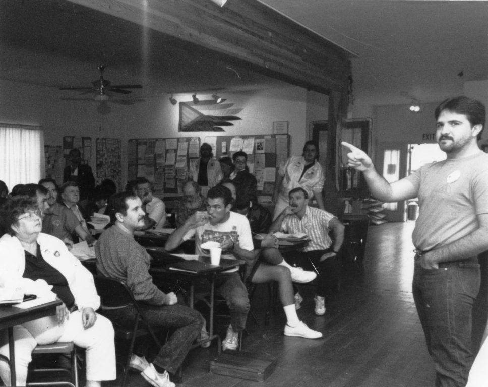 David Carranza presides over fundraising campaign meeting to purchase permanent building for the Billy DeFrank Center. Center participants eat in a community hall while listening.