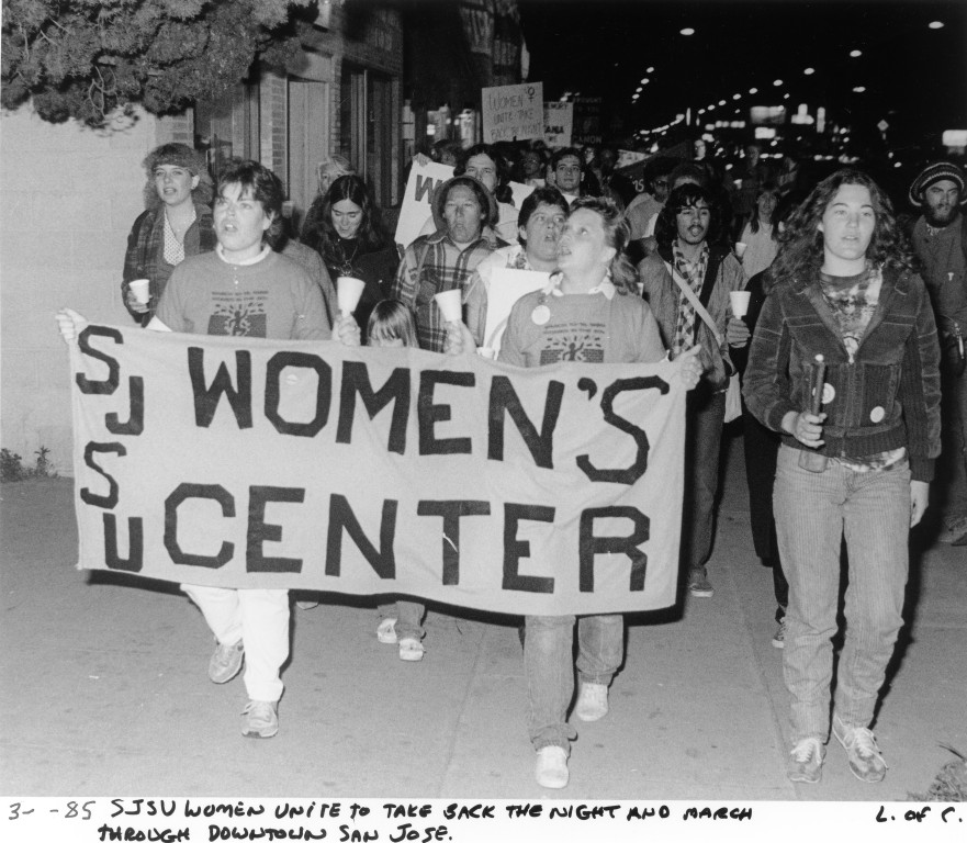Photograph shows a group, primarily made up of women, marching through downtown San Jose to take back the night. Two women in front hold a banner that reads, "SJSU Women's Center".